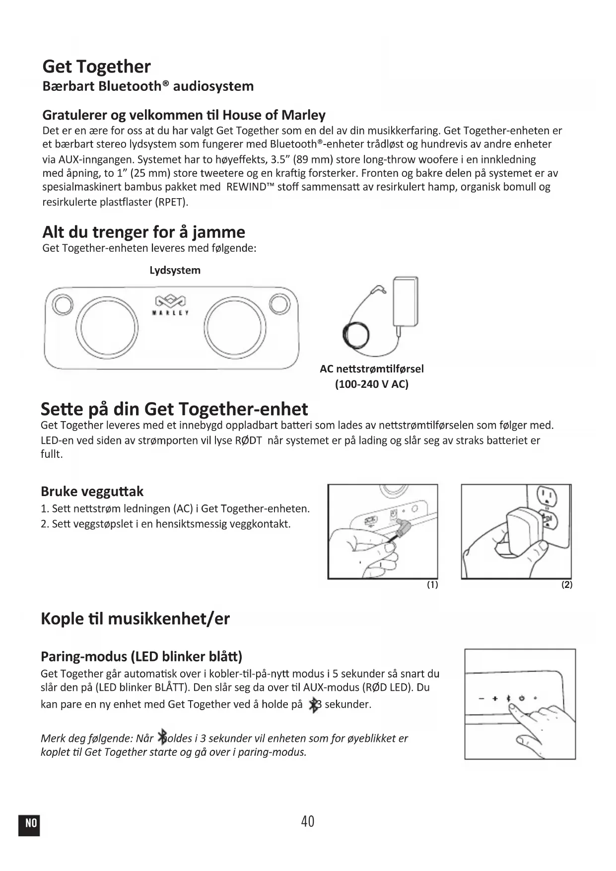 NLAR40 Get Together Bærbart Bluetooth® audiosystem Gratulerer og velkommen l House of Marley Det er en ære for oss at du har valgt Get Together som en del av din musikkerfaring. Get Together-enheten er et bærbart stereo lydsystem som fungerer med Bluetooth®-enheter trådløst og hundrevis av andre enheter via AUX-inngangen. Systemet har to høyeekts, 3.5” (89 mm) store long-throw woofere i en innkledning med åpning, to 1” (25 mm) store tweetere og en kraig forsterker. Fronten og bakre delen på systemet er av spesialmaskinert bambus pakket med REWIND™ sto sammensa av resirkulert hamp, organisk bomull og resirkulerte plaslaster (RPET). Alt du trenger for å jamme Get Together-enheten leveres med følgende: Lydsystem AC nestrømlførsel (100-240 V AC) See på din Get Together-enhet Get Together leveres med et innebygd oppladbart baeri som lades av nestrømlførselen som følger med. LED-en ved siden av strømporten vil lyse RØDT når systemet er på lading og slår seg av straks baeriet er fullt. Bruke vegguak