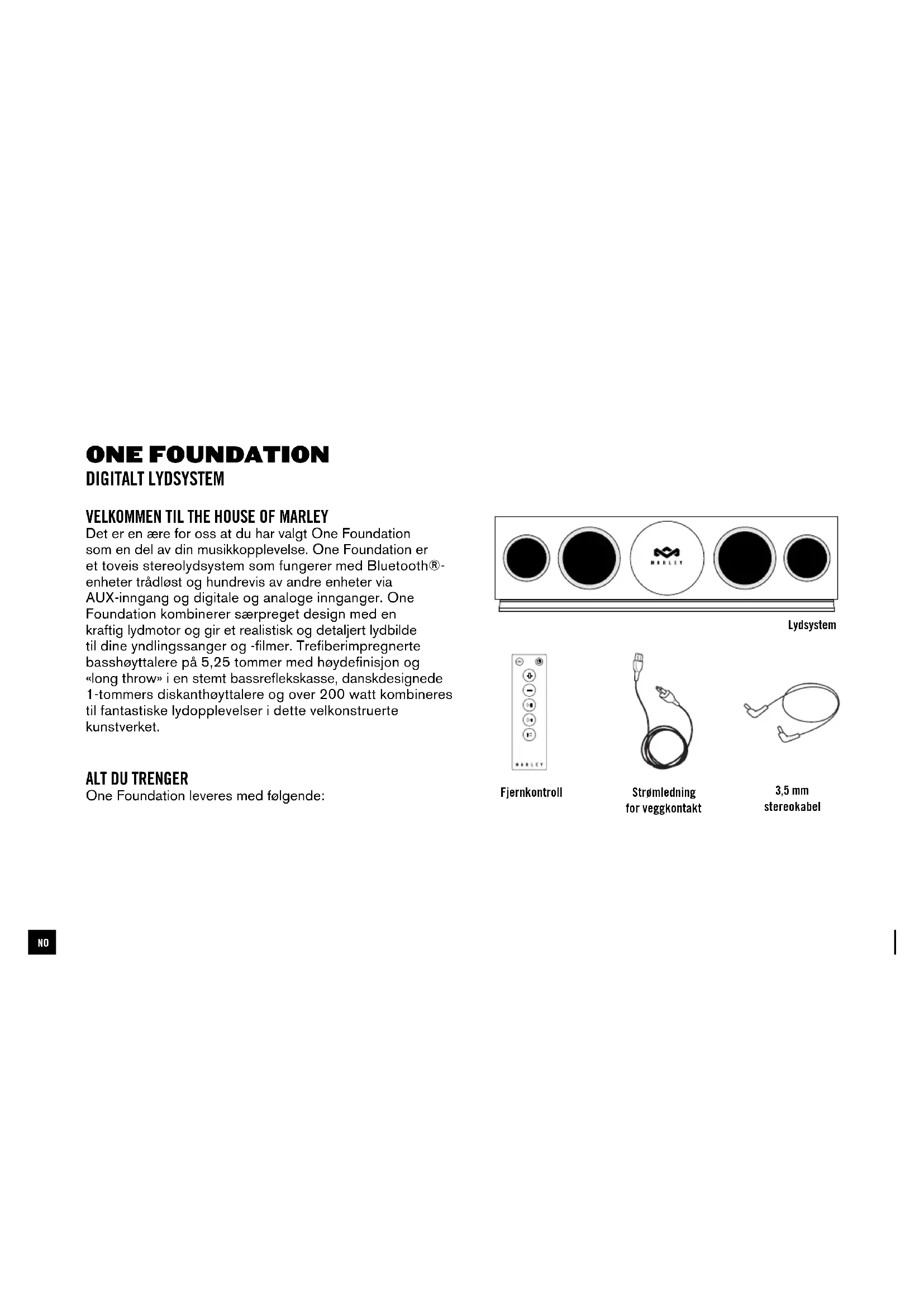 Det er en ære for oss at du har valgt One Foundation som en del av din musikkopplevelse. One Foundation er et toveis stereolydsystem som fungerer med Bluetooth®- enheter trådløst og hundrevis av andre enheter via AUX-inngang og digitale og analoge innganger. One Foundation kombinerer særpreget design med en kraftig lydmotor og gir et realistisk og detaljert lydbilde til dine yndlingssanger og -filmer. Trefiberimpregnerte basshøyttalere på 5,25 tommer med høydefinisjon og «long throw» i en stemt bassreflekskasse, danskdesignede 1-tommers diskanthøyttalere og over 200 watt kombineres til fantastiske lydopplevelser i dette velkonstruerte kunstverket.