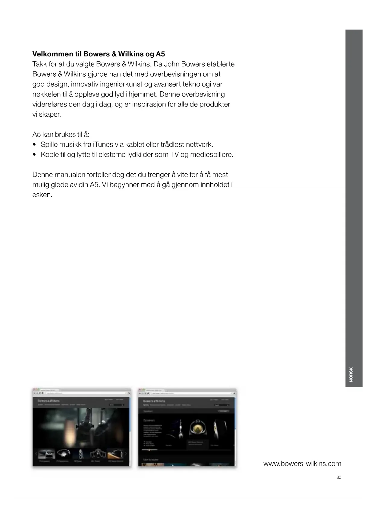 NORSK www.bowers-wilkins.com Velkommen til Bowers & Wilkins og A5 Takk for at du valgte Bowers & Wilkins. Da John Bowers etablerte Bowers & Wilkins gjorde han det med overbevisningen om at god design, innovativ ingeniørkunst og avansert teknologi var nøkkelen til å oppleve god lyd i hjemmet. Denne overbevisning videreføres den dag i dag, og er inspirasjon for alle de produkter vi skaper. A5 kan brukes til å: