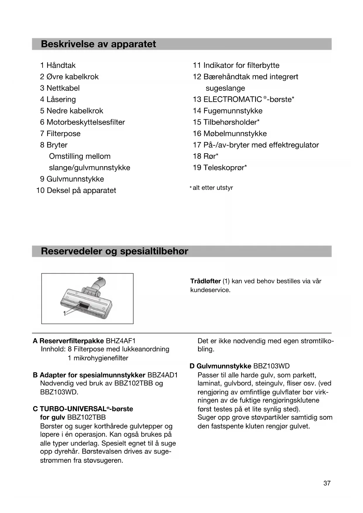 -børste for gulv BBZ102TBB Børster og suger korthårede gulvtepper og løpere i én operasjon. Kan også brukes på alle typer underlag. Spesielt egnet til å suge opp dyrehår. Børstevalsen drives av suge- strømmen fra støvsugeren. Trådløfter (1) kan ved behov bestilles via vår kundeservice. Det er ikke nødvendig med egen strømtilko- bling. D Gulvmunnstykke BBZ103WD Passer til alle harde gulv, som parkett, laminat, gulvbord, steingulv, fliser osv. (ved rengjøring av ømfintlige gulvflater bør virk- ningen av de fuktige rengjøringsklutene først testes på et lite synlig sted). Suger opp grove støvpartikler samtidig som den fastspente kluten rengjør gulvet.