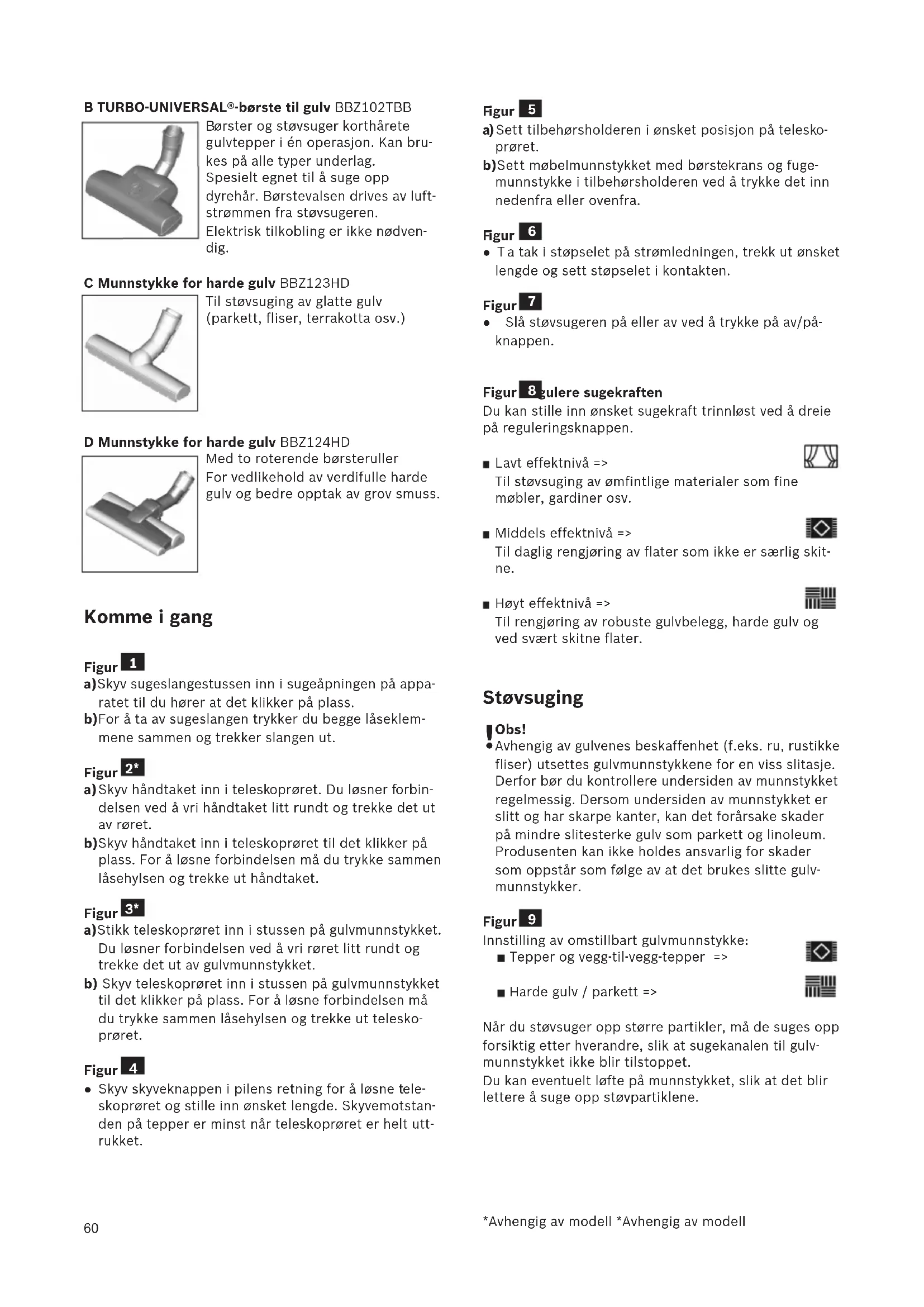 ig. C Munnstykke for harde gulv BBZ123HD Til støvsuging av glatte gulv (parkett, fliser, terrakotta osv.) D Munnstykke for harde gulv BBZ124HD Med to roterende børsteruller For vedlikehold av verdifulle harde gulv og bedre opptak av grov smuss. Komme i gang Figur a)Skyv sugeslangestussen inn i sugeåpningen på appa- ratet til du hører at det klikker på plass. b)For å ta av sugeslangen trykker du begge låseklem- mene sammen og trekker slangen ut. Figur a)Skyv håndtaket inn i teleskoprøret. Du løsner forbin- delsen ved å vri håndtaket litt rundt og trekke det ut av røret. b)Skyv håndtaket inn i teleskoprøret til det klikker på plass. For å løsne forbindelsen må du trykke sammen låsehylsen og trekke ut håndtaket. Figur a)Stikk teleskoprøret inn i stussen på gulvmunnstykket. Du løsner forbindelsen ved å vri røret litt rundt og trekke det ut av gulvmunnstykket. b) Skyv teleskoprøret inn i stussen på gulvmunnstykket til det klikker på plass. For å løsne forbindelsen må du trykke sammen låsehylsen og trekke ut telesko- prøret. Figur ● Skyv skyveknappen i pilens retning for å løsne tele- skoprøret og stille inn ønsket lengde. Skyvemotstan- den på tepper er minst når teleskoprøret er helt utt- rukket.