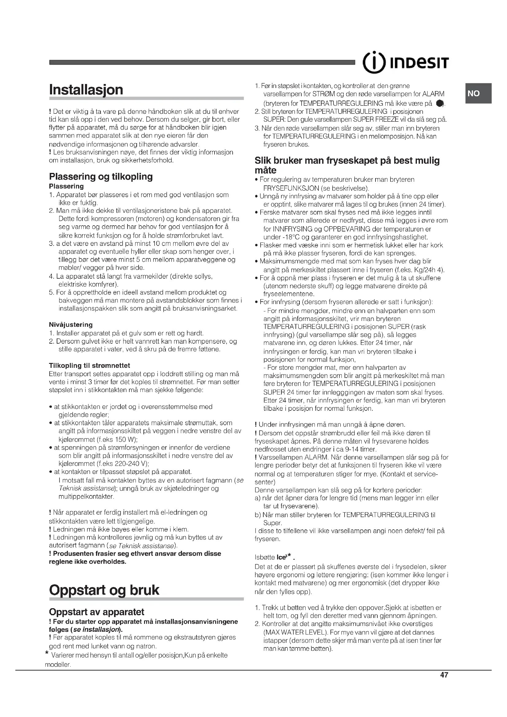 Les bruksanvisningen nøye, det finnes der viktig informasjonom installasjon, bruk og sikkerhetsforhold. Plassering og tilkopling Plassering1. Apparatet bør plasseres i et rom med god ventilasjon somikke er fuktig.2. Man må ikke dekke til ventilasjoneristene bak på apparatet.Dette fordi kompressoren (motoren) og kondensatoren gir fraseg varme og dermed har behov for god ventilasjon for åsikre korrekt funksjon og for å holde strømforbruket lavt.3. a det være en avstand på minst 10 cm mellom øvre del avapparatet og eventuelle hyller eller skap som henger over, itillegg bør det være minst 5 cm mellom apparatveggene ogmøbler/ vegger på hver side.4. La apparatet stå langt fra varmekilder (direkte sollys,elektriske komfyrer).5. For å opprettholde en ideell avstand mellom produktet ogbakveggen må man montere på avstandsblokker som finnes iinstallasjonspakken slik som angitt på bruksanvisningsarket.Nivåjustering1. Installer apparatet på et gulv som er rett og hardt.2. Dersom gulvet ikke er helt vannrett kan man kompensere, ogstille apparatet i vater, ved å skru på de fremre føttene.Tilkopling til strømnettetEtter transport settes apparatet opp i loddrett stilling og man måvente i minst 3 timer før det koples til strømnettet. Før man setterstøpslet inn i stikkontakten må man sjekke følgende:• at stikkontakten er jordet og i overensstemmelse medgjeldende regler;• at stikkontakten tåler apparatets maksimale strømuttak, somangitt på informasjonsskiltet på veggen i nedre venstre del avkjølerommet (f.eks 150 W);• at spenningen på strømforsyningen er innenfor de verdienesom blir angitt på informasjonsskiltet i nedre venstre del avkjølerommet (f.eks 220-240 V);• at kontakten er tilpasset støpslet på apparatet.I motsatt fall må kontakten byttes av en autorisert fagmann (