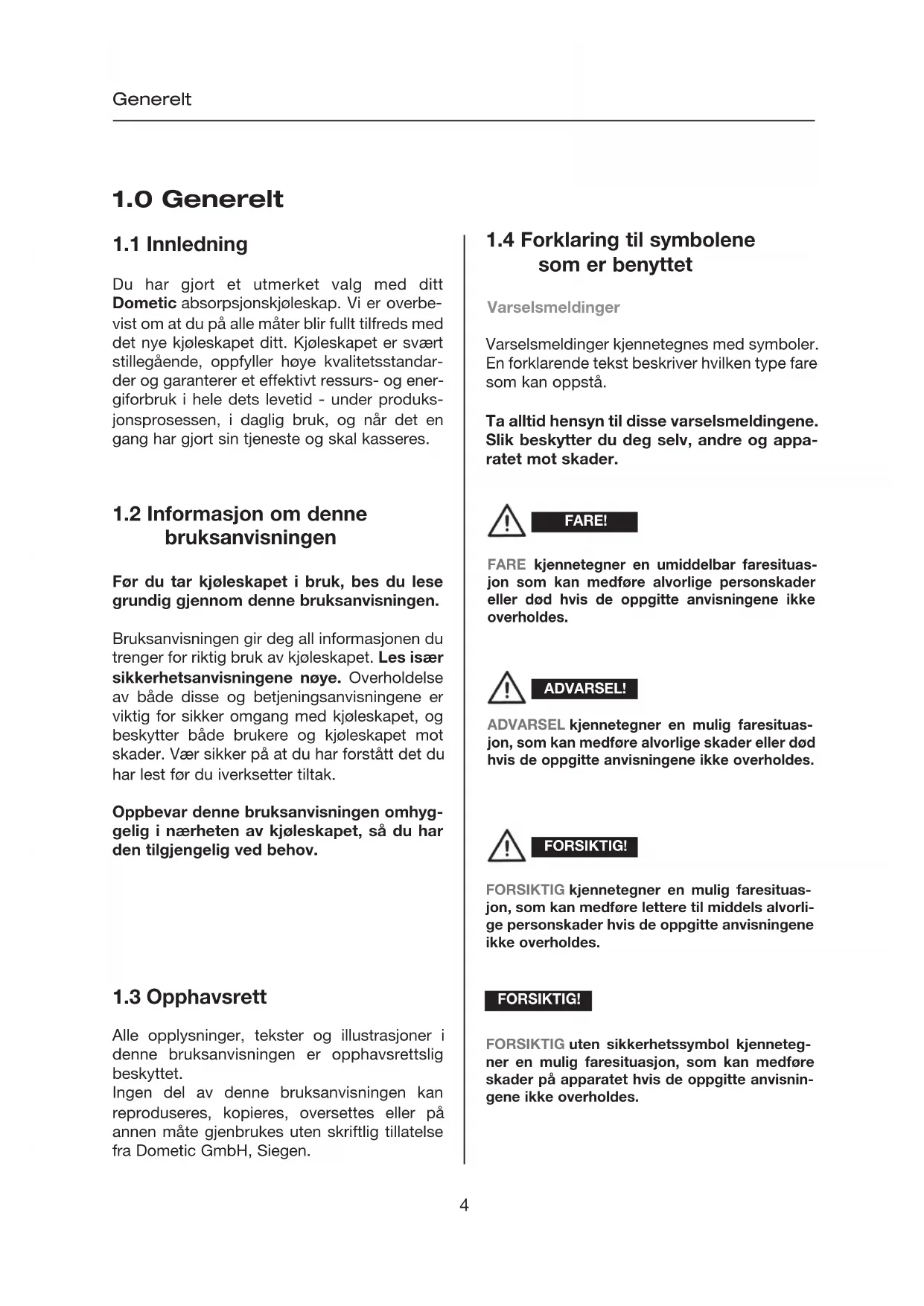 Generelt Du har gjort et utmerket valg med ditt Dometic absorpsjonskjøleskap. Vi er overbe- vist om at du på alle måter blir fullt tilfreds med det nye kjøleskapet ditt. Kjøleskapet er svært stillegående, oppfyller høye kvalitetsstandar- der og garanterer et effektivt ressurs- og ener- giforbruk i hele dets levetid - under produks- jonsprosessen, i daglig bruk, og når det en gang har gjort sin tjeneste og skal kasseres.