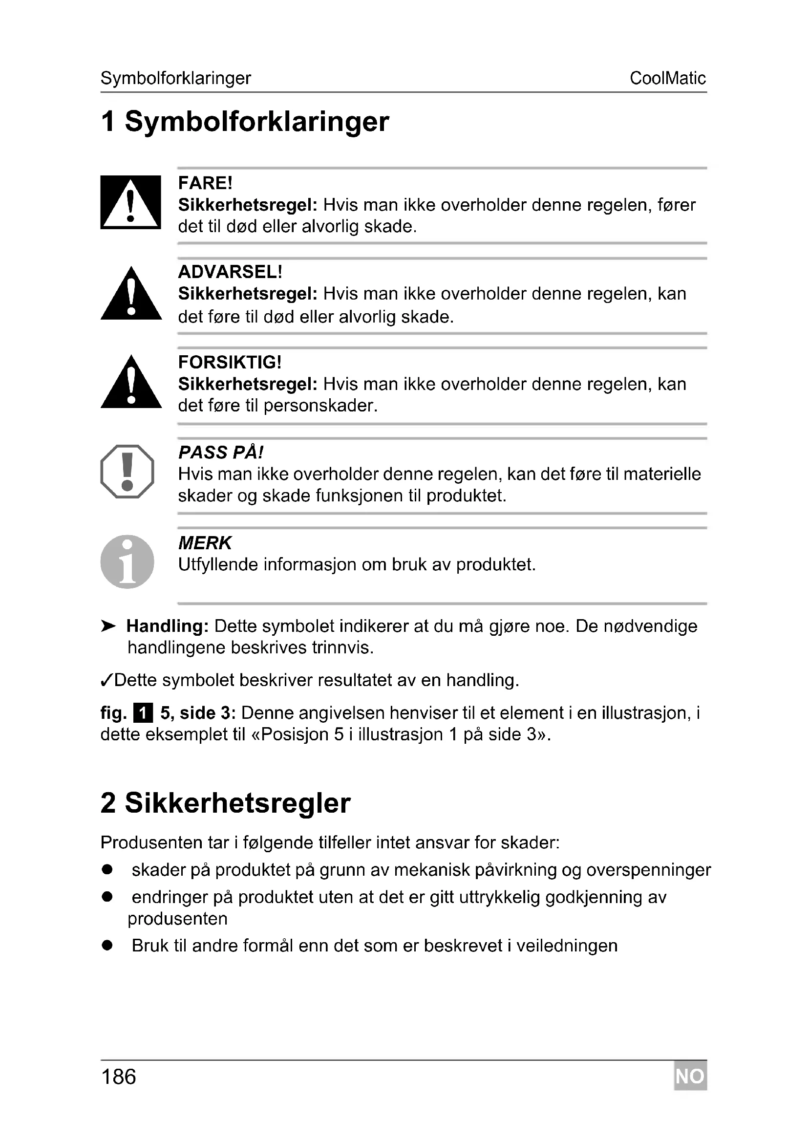 MERK Utfyllende informasjon om bruk av produktet. ➤ Handling: Dette symbolet indikerer at du må gjøre noe. De nødvendige handlingene beskrives trinnvis. ✓ Dette symbolet beskriver resultatet av en handling. fig. 1 5, side 3: Denne angivelsen henviser til et element i en illustrasjon, i dette eksemplet til «Posisjon 5 i illustrasjon 1 på side 3». 2 Sikkerhetsregler Produsenten tar i følgende tilfeller intet ansvar for skader: skader på produktet på grunn av mekanisk påvirkning og overspenninger endringer på produktet uten at det er gitt uttrykkelig godkjenning av produsenten Bruk til andre formål enn det som er beskrevet i veiledningenNO CoolMatic Sikkerhetsregler