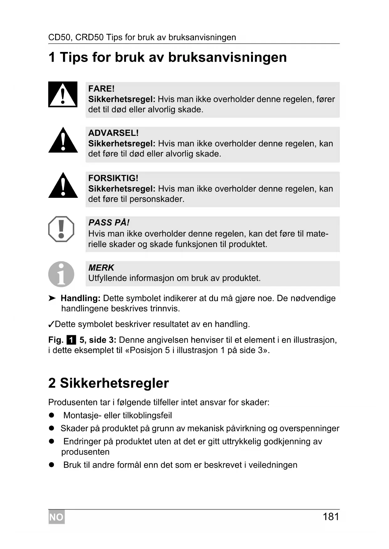 ➤ Handling: Dette symbolet indikerer at du må gjøre noe. De nødvendige handlingene beskrives trinnvis. ✓ Dette symbolet beskriver resultatet av en handling. Fig. 1 5, side 3: Denne angivelsen henviser til et element i en illustrasjon, i dette eksemplet til «Posisjon 5 i illustrasjon 1 på side 3». 2 Sikkerhetsregler Produsenten tar i følgende tilfeller intet ansvar for skader: Montasje- eller tilkoblingsfeil Skader på produktet på grunn av mekanisk påvirkning og overspenninger Endringer på produktet uten at det er gitt uttrykkelig godkjenning av produsenten Bruk til andre formål enn det som er beskrevet i veiledningen FARE! Sikkerhetsregel: Hvis man ikke overholder denne regelen, fører det til død eller alvorlig skade. ADVARSEL! Sikkerhetsregel: Hvis man ikke overholder denne regelen, kan det føre til død eller alvorlig skade. FORSIKTIG! Sikkerhetsregel: Hvis man ikke overholder denne regelen, kan det føre til personskader. PASS PÅ! Hvis man ikke overholder denne regelen, kan det føre til mate- rielle skader og skade funksjonen til produktet. MERK Utfyllende informasjon om bruk av produktet.NO Sikkerhetsregler CD50, CRD50
