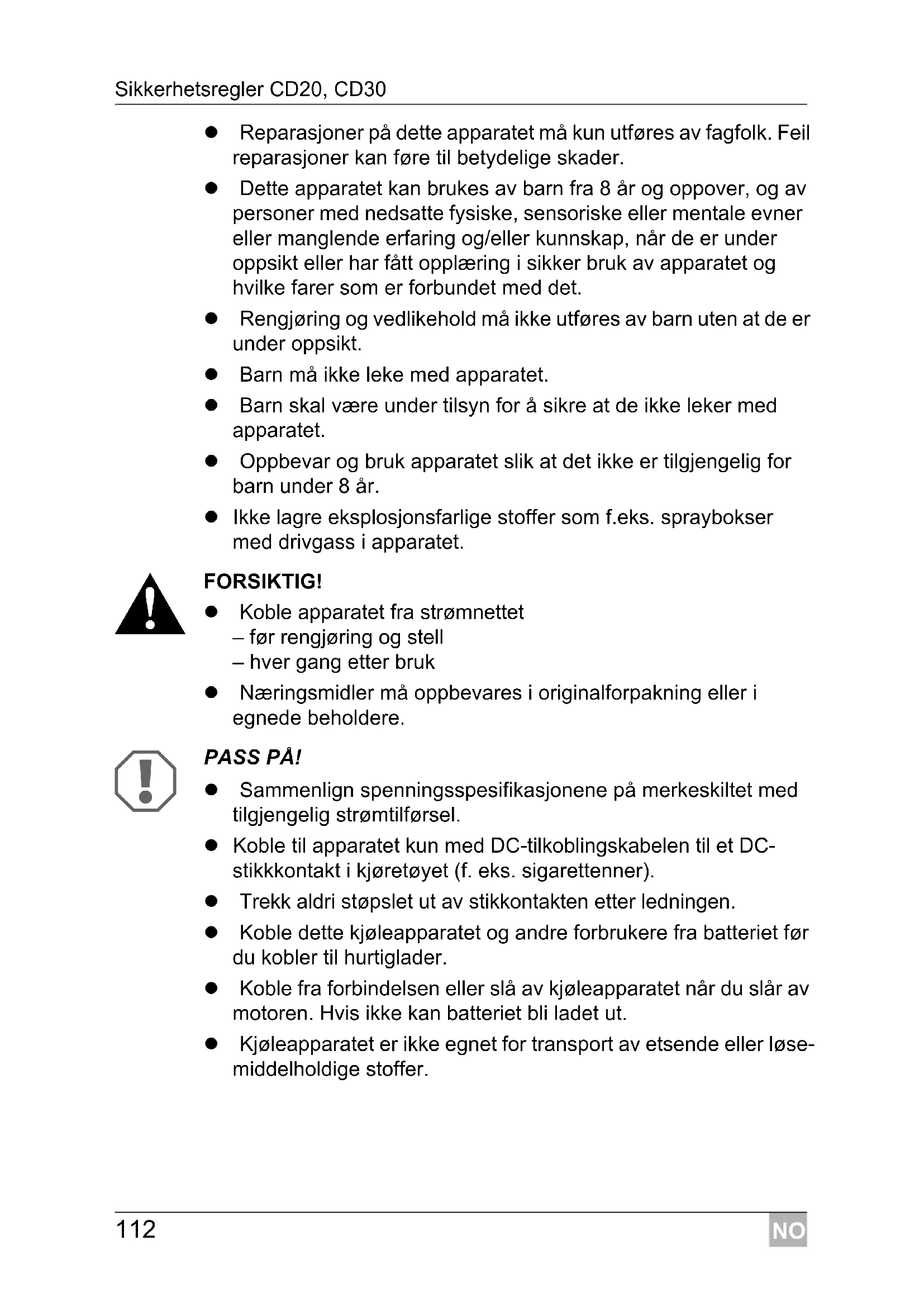 Innetemperatur for lav for termonstatinnstillingen «MIN» Kjølebelastningen øker, innetemperaturen stiger Mye støy Kjennetegn Mulig årsak Løsning Kompressoren går konti- nuerlig Termostatføleren kan ikke kontakt med fordamperen Fest føleren Kortslutning i termostatledningen Bytt termostaten Termostat defekt Kompressoren går lenge Mye påfrysing i fordamperrommet Kjennetegn Mulig årsak Løsning Kompressoren går lenge/kontinuerlig Fordamperen iser ned Fordamperen avrimes Isoleringen av kjølerommet ikke til- strekkelig (fuktighet/støv) Korriger/bytt tettingen til skuffene Omgivelsestemperaturen for høy Utilstrekkelig ventilasjon Sørg for tilstrekkelig venti- lasjon Kondensatoren er skitten Rengjør kondensatoren Viften er defekt (hvis en slik er montert) Bytt viften Kompressoren går sjelden Batteriene utslitt Lade batteri Kjennetegn Mulig årsak Løsning Høy brumming Komponenten til kjølekretsløpet kan ikke svinge fritt (ligger i veggen) Bøy komponenten forsiktig av Fremmedlegeme innklemt mellom kjølemaskin og vegg Fjern fremmedlegemer Viftestøy –NO Tekniske data CD20, CD30 Forstyrrelser på radio eller fjernsyn i kjøretøyet 12 Tekniske data Kjennetegn Mulig årsak LøsningMottaksstøy når kompressoren gårElektronikk-tilkoblingen til kjøleappa-ratet er ikke direkte tilkoblet batterietKoble kjøleapparatet mest mulig direkte til batteri-poleneCD20 CD30 Tilkoblingsspenning: 12 Vg/24 Vg Utkoblingsspenning: 10,4 V ved 12 Vg22,8 V ved 24 VgInnkoblingsspenning: 11,7 V ved 12 Vg24,2 V ved 24 Vg Merkestrøm: 12 Vg: 3 A 24 Vg: 1,5 AKjøleeffekt: 0°C til +15°C –2°C til +12°C Nytteinnhold: 20 l 30 l Klimaklasse: NOmgivelsestemperatur: +16 °C til +32 °CLuftfuktighet: Maks. 90 %Kontinuerlig krenging: Maks. 30° Mål: fig. 1, side 3 Vekt: 16,1 kg 18 kg Test/sertifikater: E4FI CD20, CD30 Symbolien selitykset