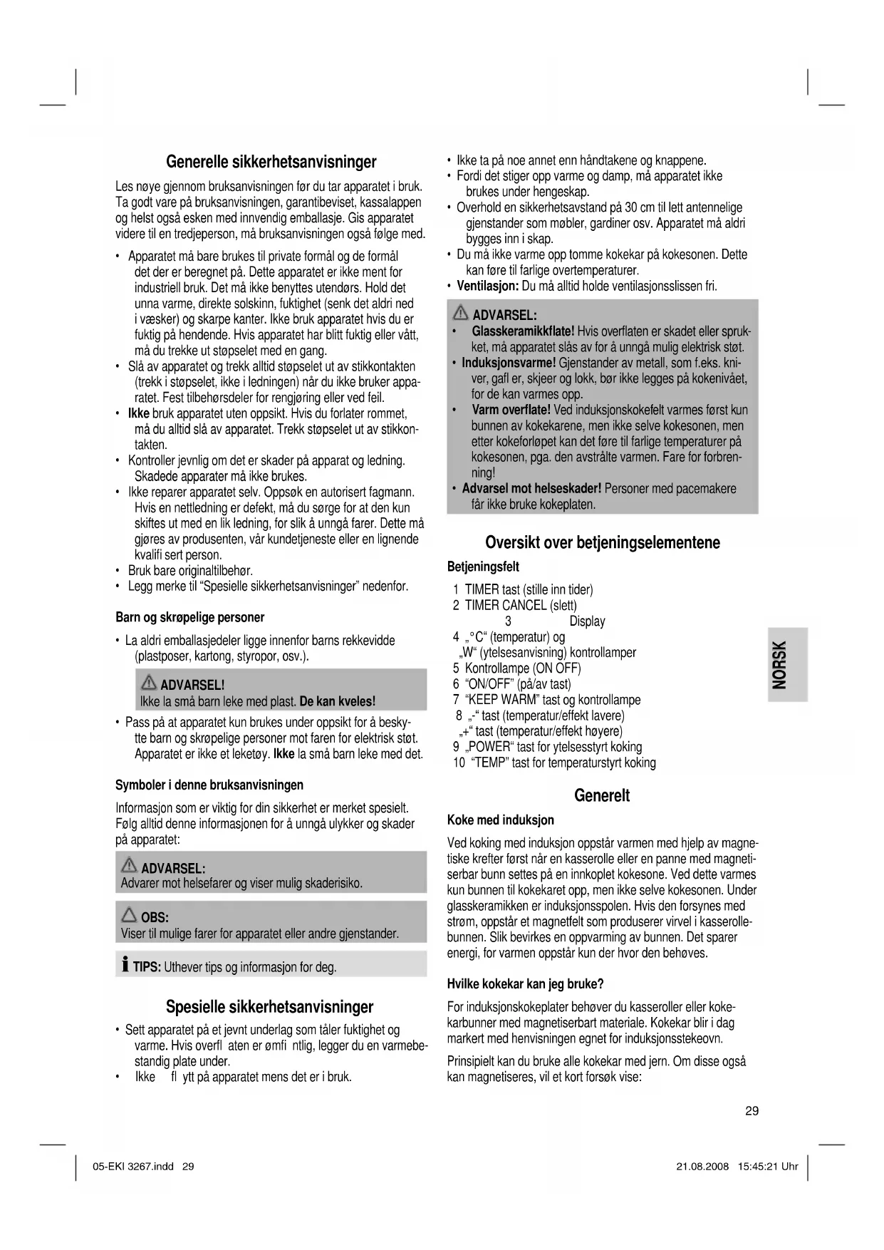 - Advarsel mot helseskader! Personer med pacemakere får ikke bruke kokeplaten. Oversikt over betjeningselementene Betjeningsfelt 1 TIMER tast (stille inn tider) 2 TIMER CANCEL (slett) 3 Display 4 „°C“ (temperatur) og „W“ (ytelsesanvisning) kontrollamper 5 Kontrollampe (ON OFF) 6 “ON/OFF” (på/av tast) 7 “KEEP WARM” tast og kontrollampe 8 „-“ tast (temperatur/effekt lavere) „+“ tast (temperatur/effekt høyere) 9 „POWER“ tast for ytelsesstyrt koking 10 “TEMP” tast for temperaturstyrt koking Generelt Koke med induksjon Ved koking med induksjon oppstår varmen med hjelp av magne- tiske krefter først når en kasserolle eller en panne med magneti- serbar bunn settes på en innkoplet kokesone. Ved dette varmes kun bunnen til kokekaret opp, men ikke selve kokesonen. Under glasskeramikken er induksjonsspolen. Hvis den forsynes med strøm, oppstår et magnetfelt som produserer virvel i kasserolle- bunnen. Slik bevirkes en oppvarming av bunnen. Det sparer energi, for varmen oppstår kun der hvor den behøves. Hvilke kokekar kan jeg bruke? For induksjonskokeplater behøver du kasseroller eller koke- karbunner med magnetiserbart materiale. Kokekar blir i dag markert med henvisningen egnet for induksjonsstekeovn. Prinsipielt kan du bruke alle kokekar med jern. Om disse også kan magnetiseres, vil et kort forsøk vise: 05-EKI 3267.indd 2905-EKI 3267.indd 29 21.08.2008 15:45:21 Uhr21.08.2008 15:45:21 Uhr30 NORSK NORSK Sett på den gjeldene kasserollen. Hvis du hører et signal etter at kokefunksjonen ble valgt og apparatet ble slått på, er kasse- rollen ubrukelig. TIPS: Av sikkerhetsgrunner slår apparatet seg i beredskapstilstand etter få sekunder. Disse materialene kan du ikke bruke som kokekar: Leire, glass eller aluminium. Disse kasserollene kan du ikke bruke: Kasseroller med rund bunn. Kasseroller med di- ameter mindre enn 12 cm på bunnen. Kasseroller som står på føtter. Elektrisk tilkobling Tilkoblingsverdi Totalt kan kokeplaten ta opp en ytelse på 2000 W. Ved denne tilkoblingsverdien anbefales en atskilt tilførsel med en avsikring over en 16 A husholdningsvernebryter. ADVARSEL MOT OVERBELASTNING! Ikke bruk skjøteledninger eller multi-stikkontakter, for dette apparatet har for sterk ytelse. Tilkobling