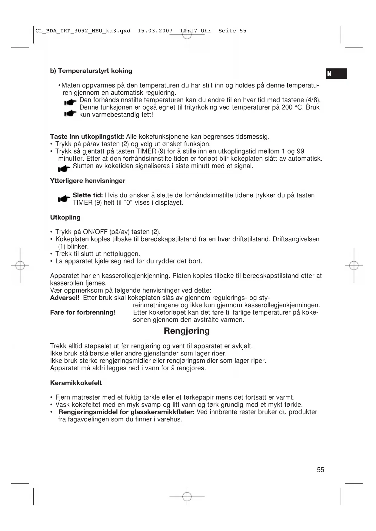 Betjeningsfelt 1 Driftsangivelse 6 Display 2 ON/OFF (på/av tast) 7 Kontrollampe til effektfunksjonen 3 FUNCTION tast (kokefunksjoner) 8 - tast (temperatur/effekt lavere) 4 + tast (temperatur/effekt høyere) 9 TIMER tast (stille inn tider) 5 Kontrollampe til temperaturfunksjonen 10 Temperatur/effektvisning Generelt Koke med induksjon Ved koking med induksjon oppstår varmen med hjelp av magnetiske krefter først når en kasserolle eller en panne med magnetiserbar bunn settes på en innkoplet kokesone. Ved dette varmes kun bunnen til kokekaret opp, men ikke kokesonen selv. Under glasskeramik- ken er induksjonsspolen. Hvis den forsynes med strøm oppstår et magnetfelt som produse- rer virvel i kasserollebunnen. Gjennom dette bevirkes en oppvarming av bunnen. Det sparer energi, for varmen oppstår kun der hvor den behøves. Hvilke kokekar kan jeg bruke? For induksjonskokeplater behøver du kasseroller eller kokekarbunner med magnetiserbar material. Kokekar blir i dag markert med henvisningen egnet for induksjonsstekeovn. Prinsipielt kan du bruke alle kokekar med jern, om disse også kan magnetiseres viser et kort forsøk: Sett på den gjeldene kasserollen. Hvis du hører et signal etter at kokefunksjonen ble valgt og apparatet ble slått på er kasserollen ubrukelig. Av sikkerhetsgrunner slår apparatet seg i beredskapstilstand etter få sekunder. Disse materialene kan du ikke bruke som kokekar: Leire, glass eller aluminium. Disse kasserollene kan du ikke bruke: Kasseroller med rund bunn. Kasseroller med diameter Kasseroller som mindre enn 12 cm på bunnen. står på føtter. CL_BDA_IKP_3092_NEU_ka3.qxd 15.03.2007 10:17 Uhr Seite 53Elektrisk forbindelse Forbindelsesverdi Totalt kan kokeplaten ta opp en ytelse på 1800W. Ved denne forbindelsesverdien anbefales en atskilt tilledning med en avsikring over en 16A husholdningsvernebryter. Advarsel mot overbelastning! Ikke bruk forlengelsesledninger eller multi-stikkontakter, for dette apparatet har for sterk ytelse. Tilkobling