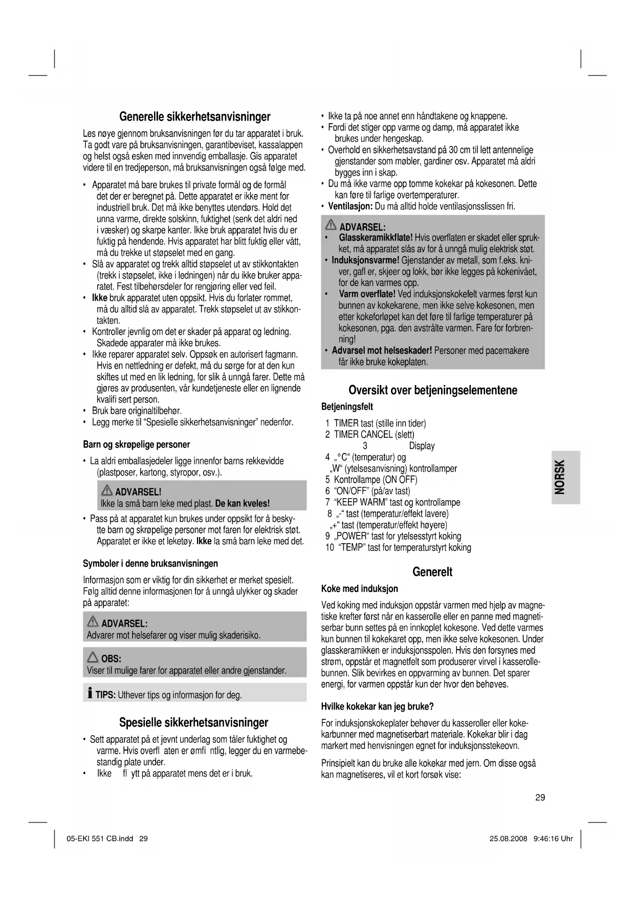 - Advarsel mot helseskader! Personer med pacemakere får ikke bruke kokeplaten. Oversikt over betjeningselementene Betjeningsfelt 1 TIMER tast (stille inn tider) 2 TIMER CANCEL (slett) 3 Display 4 „°C“ (temperatur) og „W“ (ytelsesanvisning) kontrollamper 5 Kontrollampe (ON OFF) 6 “ON/OFF” (på/av tast) 7 “KEEP WARM” tast og kontrollampe 8 „-“ tast (temperatur/effekt lavere) „+“ tast (temperatur/effekt høyere) 9 „POWER“ tast for ytelsesstyrt koking 10 “TEMP” tast for temperaturstyrt koking Generelt Koke med induksjon Ved koking med induksjon oppstår varmen med hjelp av magne- tiske krefter først når en kasserolle eller en panne med magneti- serbar bunn settes på en innkoplet kokesone. Ved dette varmes kun bunnen til kokekaret opp, men ikke selve kokesonen. Under glasskeramikken er induksjonsspolen. Hvis den forsynes med strøm, oppstår et magnetfelt som produserer virvel i kasserolle- bunnen. Slik bevirkes en oppvarming av bunnen. Det sparer energi, for varmen oppstår kun der hvor den behøves. Hvilke kokekar kan jeg bruke? For induksjonskokeplater behøver du kasseroller eller koke- karbunner med magnetiserbart materiale. Kokekar blir i dag markert med henvisningen egnet for induksjonsstekeovn. Prinsipielt kan du bruke alle kokekar med jern. Om disse også kan magnetiseres, vil et kort forsøk vise: 05-EKI 551 CB.indd 2905-EKI 551 CB.indd 29 25.08.2008 9:46:16 Uhr25.08.2008 9:46:16 Uhr30 NORSK NORSK Sett på den gjeldene kasserollen. Hvis du hører et signal etter at kokefunksjonen ble valgt og apparatet ble slått på, er kasse- rollen ubrukelig. TIPS: Av sikkerhetsgrunner slår apparatet seg i beredskapstilstand etter få sekunder. Disse materialene kan du ikke bruke som kokekar: Leire, glass eller aluminium. Disse kasserollene kan du ikke bruke: Kasseroller med rund bunn. Kasseroller med di- ameter mindre enn 12 cm på bunnen. Kasseroller som står på føtter. Elektrisk tilkobling Tilkoblingsverdi Totalt kan kokeplaten ta opp en ytelse på 2000 W. Ved denne tilkoblingsverdien anbefales en atskilt tilførsel med en avsikring over en 16 A husholdningsvernebryter. ADVARSEL MOT OVERBELASTNING! Ikke bruk skjøteledninger eller multi-stikkontakter, for dette apparatet har for sterk ytelse. Tilkobling