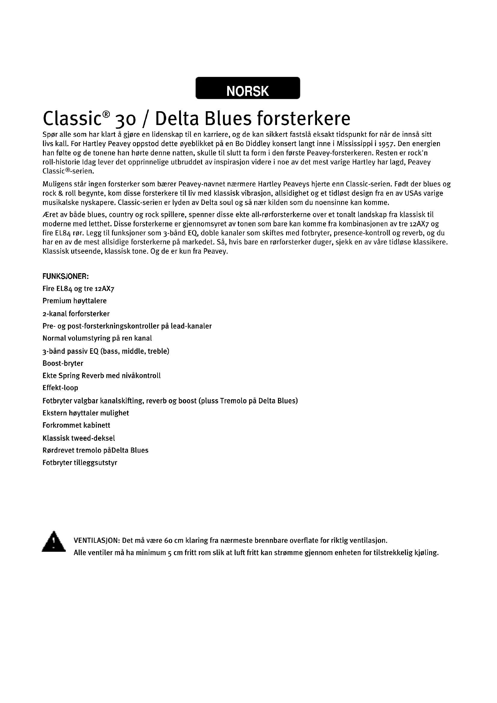 -serien. Muligens står ingen forsterker som bærer Peavey-navnet nærmere Hartley Peaveys hjerte enn Classic-serien. Født der blues og rock & roll begynte, kom disse forsterkere til liv med klassisk vibrasjon, allsidighet og et tidløst design fra en av USAs varige musikalske nyskapere. Classic-serien er lyden av Delta soul og så nær kilden som du noensinne kan komme. Æret av både blues, country og rock spillere, spenner disse ekte all-rørforsterkerne over et tonalt landskap fra klassisk til moderne med letthet. Disse forsterkerne er gjennomsyret av tonen som bare kan komme fra kombinasjonen av tre 12AX7 og fire EL84 rør. Legg til funksjoner som 3-bånd EQ, doble kanaler som skiftes med fotbryter, presence-kontroll og reverb, og du har en av de mest allsidige forsterkerne på markedet. Så, hvis bare en rørforsterker duger, sjekk en av våre tidløse klassikere. Klassisk utseende, klassisk tone. Og de er kun fra Peavey. FUNKSJONER: Fire EL84 og tre 12AX7 Premium høyttalere 2-kanal forforsterker Pre- og post-forsterkningskontroller på lead-kanaler Normal volumstyring på ren kanal 3-bånd passiv EQ (bass, middle, treble) Boost-bryter Ekte Spring Reverb med nivåkontroll Effekt-loop Fotbryter valgbar kanalskifting, reverb og boost (pluss Tremolo på Delta Blues) Ekstern høyttaler mulighet Forkrommet kabinett Klassisk tweed-deksel Rørdrevet tremolo påDelta Blues Fotbryter tilleggsutstyr NORSK VENTILASJON: Det må være 60 cm klaring fra nærmeste brennbare overflate for riktig ventilasjon. Alle ventiler må ha minimum 5 cm fritt rom slik at luft fritt kan strømme gjennom enheten for tilstrekkelig kjøling.Classic