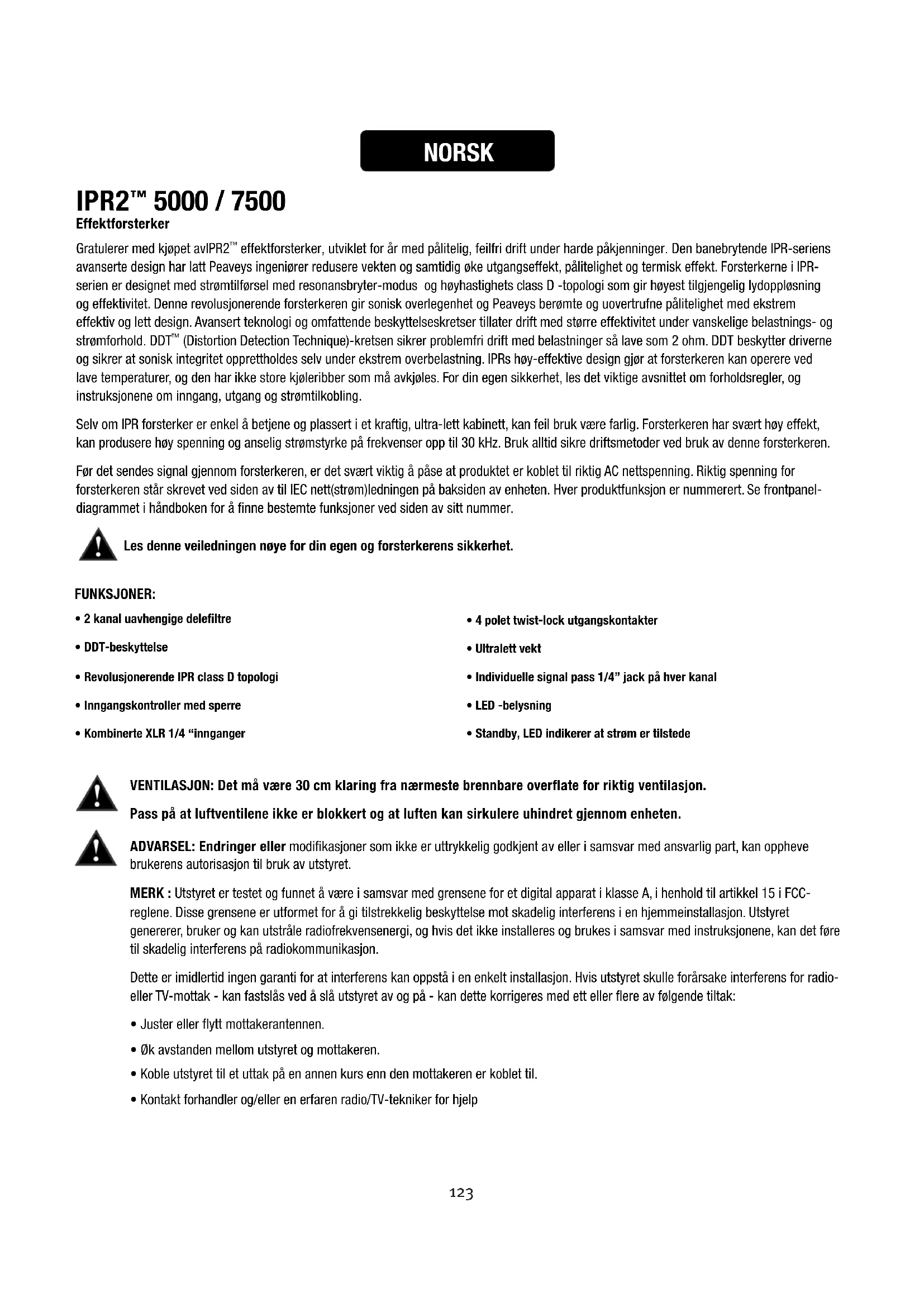 (Distortion Detection Technique)-kretsen sikrer problemfri drift med belastninger så lave som 2 ohm. DDT beskytter driverne og sikrer at sonisk integritet opprettholdes selv under ekstrem overbelastning. IPRs høy-effektive design gjør at forsterkeren kan operere ved lave temperaturer, og den har ikke store kjøleribber som må avkjøles. For din egen sikkerhet, les det viktige avsnittet om forholdsregler, og instruksjonene om inngang, utgang og strømtilkobling. Selv om IPR forsterker er enkel å betjene og plassert i et kraftig, ultra-lett kabinett, kan feil bruk være farlig. Forsterkeren har svært høy effekt, kan produsere høy spenning og anselig strømstyrke på frekvenser opp til 30 kHz. Bruk alltid sikre driftsmetoder ved bruk av denne forsterkeren. Før det sendes signal gjennom forsterkeren, er det svært viktig å påse at produktet er koblet til riktig AC nettspenning. Riktig spenning for forsterkeren står skrevet ved siden av til IEC nett(strøm)ledningen på baksiden av enheten. Hver produktfunksjon er nummerert. Se frontpanel- diagrammet i håndboken for å finne bestemte funksjoner ved siden av sitt nummer. Les denne veiledningen nøye for din egen og forsterkerens sikkerhet. NORSK VENTILASJON: Det må være 30 cm klaring fra nærmeste brennbare overflate for riktig ventilasjon. Pass på at luftventilene ikke er blokkert og at luften kan sirkulere uhindret gjennom enheten. FUNKSJONER: