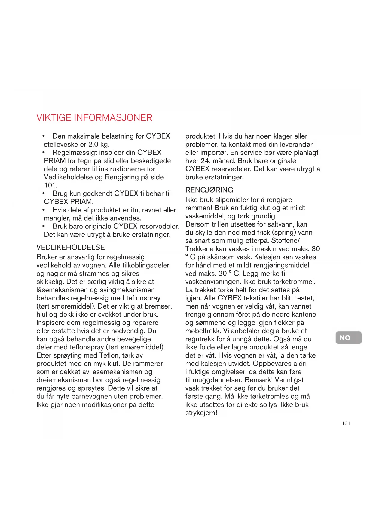 y Brug kun godkendt CYBEX tilbehør til CYBEX PRIAM. y Hvis dele af produktet er itu, revnet eller mangler, må det ikke anvendes. y Bruk bare originale CYBEX reservedeler. Det kan være utrygt å bruke erstatninger. VIKTIGE INFORMASJONER RENGJØRING Ikke bruk slipemidler for å rengjøre rammen! Bruk en fuktig klut og et mildt vaskemiddel, og tørk grundig. Dersom trillen utsettes for saltvann, kan du skylle den ned med frisk (spring) vann så snart som mulig etterpå. Stoffene/ Trekkene kan vaskes i maskin ved maks. 30 ° C på skånsom vask. Kalesjen kan vaskes for hånd med et mildt rengjøringsmiddel ved maks. 30 ° C. Legg merke til vaskeanvisningen. Ikke bruk tørketrommel. La trekket tørke helt før det settes på igjen. Alle CYBEX tekstiler har blitt testet, men når vognen er veldig våt, kan vannet trenge gjennom fôret på de nedre kantene og sømmene og legge igjen flekker på møbeltrekk. Vi anbefaler deg å bruke et regntrekk for å unngå dette. Også må du ikke folde eller lagre produktet så lenge det er våt. Hvis vognen er våt, la den tørke med kalesjen utvidet. Oppbevares aldri i fuktige omgivelser, da dette kan føre til muggdannelser. Bemærk! Vennligst vask trekket for seg før du bruker det første gang. Må ikke tørketromles og må ikke utsettes for direkte sollys! Ikke bruk strykejern! produktet. Hvis du har noen klager eller problemer, ta kontakt med din leverandør eller importør. En service bør være planlagt hver 24. måned. Bruk bare originale CYBEX reservedeler. Det kan være utrygt å bruke erstatninger.102