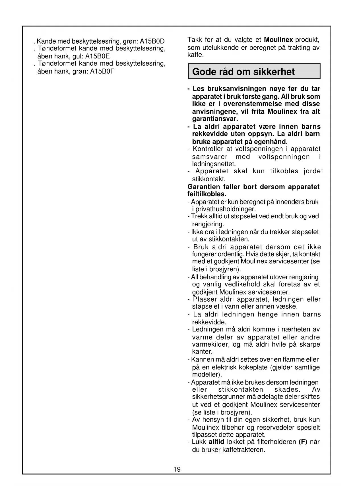 Takk for at du valgte et Moulinex-produkt, som utelukkende er beregnet på trakting av kaffe. Gode råd om sikkerhet - Les bruksanvisningen nøye før du tar apparatet i bruk første gang. All bruk som ikke er i overenstemmelse med disse anvisningene, vil frita Moulinex fra alt garantiansvar. - La aldri apparatet være innen barns rekkevidde uten oppsyn. La aldri barn bruke apparatet på egenhånd. - Kontroller at voltspenningen i apparatet samsvarer med voltspenningen i ledningsnettet. - Apparatet skal kun tilkobles jordet stikkontakt. Garantien faller bort dersom apparatet feiltilkobles. - Apparatet er kun beregnet på innendørs bruk i privathusholdninger. - Trekk alltid ut støpselet ved endt bruk og ved rengjøring. - Ikke dra i ledningen når du trekker støpselet ut av stikkontakten. - Bruk aldri apparatet dersom det ikke fungerer ordentlig. Hvis dette skjer, ta kontakt med et godkjent Moulinex servicesenter (se liste i brosjyren). - All behandling av apparatet utover rengjøring og vanlig vedlikehold skal foretas av et godkjent Moulinex servicesenter. - Plasser aldri apparatet, ledningen eller støpselet i vann eller annen væske. - La aldri ledningen henge innen barns rekkevidde. - Ledningen må aldri komme i nærheten av varme deler av apparatet eller andre varmekilder, og må aldri hvile på skarpe kanter. - Kannen må aldri settes over en flamme eller på en elektrisk kokeplate (gjelder samtlige modeller). - Apparatet må ikke brukes dersom ledningen eller stikkontakten skades. Av sikkerhetsgrunner må ødelagte deler skiftes ut ved et godkjent Moulinex servicesenter (se liste i brosjyren). - Av hensyn til din egen sikkerhet, bruk kun Moulinex tilbehør og reservedeler spesielt tilpasset dette apparatet. - Lukk alltid lokket på filterholderen (F) når du bruker kaffetrakteren. . Kande med beskyttelsesring, grøn: A15B0D . Tøndeformet kande med beskyttelsesring, åben hank, gul: A15B0E . Tøndeformet kande med beskyttelsesring, åben hank, grøn: A15B0F20 - Ikke hell opp vann i apparatet igjen hvis det fortsatt er varmt. - Ikke glem å sette lokket tilbake på kannen for å sikre at anti-drypp-systemet fungerer og unngå overfylling av filterholderen. - Alle apparater gjennomgår strenge kvalitetstester. Praktiske tester utføres på enkelte tilfeldig utvalgte apparater, noe som forklarer eventuelle spor av bruk. Første gangs bruk - Kjør kaffetrakteren første gang med full vanntank, men uten kaffe. - Fyll tanken (A), som har markeringer for store og små kopper, med kaldt vann opp til ønsket nivå. - Ha filtermalt kaffe i papirfilter nr. 4 i den avtagbare filterholderen (E). - Lukk lokket på filterholderen (F). - Plasser kannen (D) på varmeplaten (C). - Start apparatet ved hjelp av bryteren (B). Indikatorlampen vil tennes. Merk: - Kaffetrakteren er utstyrt med et anti-drypp- system som lar deg skjenke deg en kopp kaffe mens traktingen pågår. Sett kannen straks tilbake på plass for å unngå at filterholderen overfylles. - Trakteren skrur seg automatisk i “hold varm”- modus etter endt trakting. - Du kan justere ledningens lengde ved å rulle den sammen under apparatet. Vedlikehold For å garantere at kaffetrakteren fortsetter å fungere korrekt er det nødvendig å avkalke den med jevne mellomrom: . etter 80 gangers bruk ved vann med lavt kalkinnhold (ca. annenhver måned) . etter 40 gangers bruk ved veldig hardt vann (ca. én gang i måneden) . Du kan bruke: . enten en pose avkalkingsmiddel løst i to store kopper vann (3 dl). . eller to store kopper hvitvinseddik - Hell blandingen i tanken og start apparatet ved å trykke på bryteren (B). - La tilsvarende én kopp væske renne igjennom, og stopp trakteren. La den gjenværende væsken virke i en time.