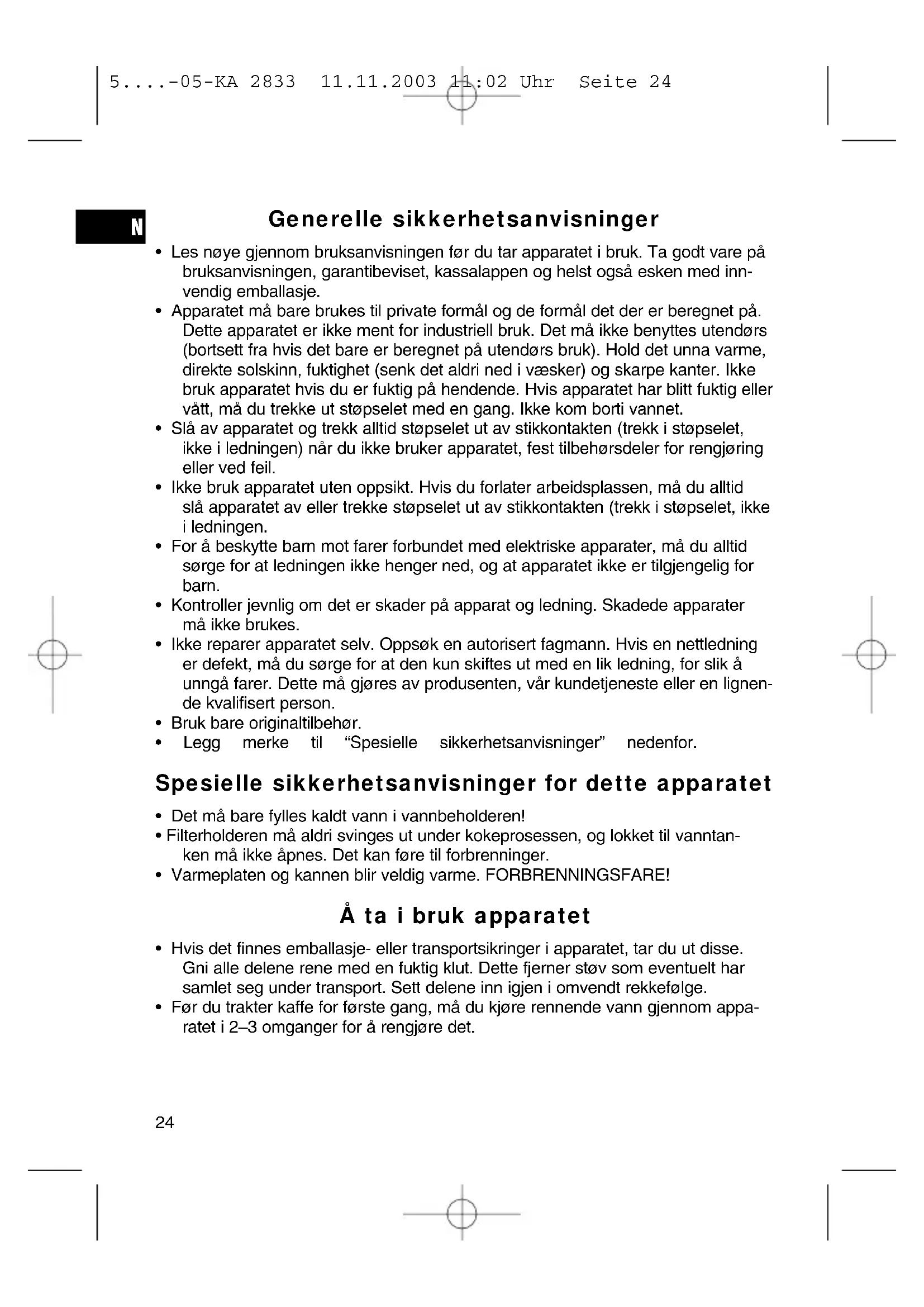- Før du trakter kaffe for første gang, må du kjøre rennende vann gjennom appa- ratet i 2–3 omganger for å rengjøre det. 5....-05-KA 2833 11.11.2003 11:02 Uhr Seite 2425