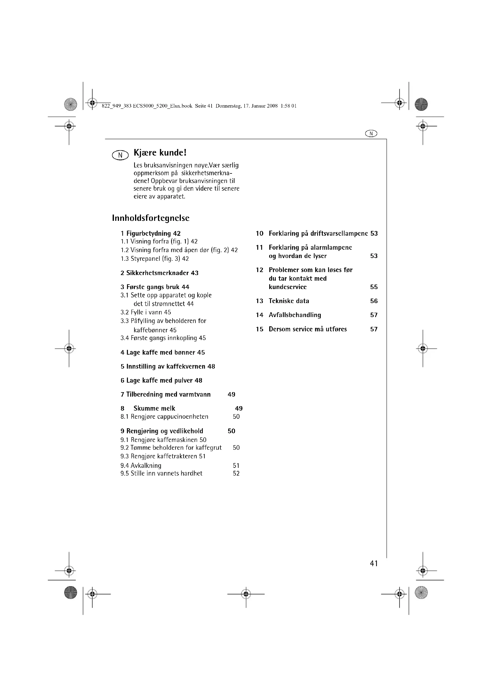 Apparatet teller antall lagede kaffe- kopper. Etter 14 enkelt (eller 7 parvis) lagede kaffekopper lyser varsellampen og indikerer at beholderen for kaf- fegrut er full og må tømmes/rengjøres. Så lenge beholderen for kaffegrut ikke er rengjort, kan ikke kaffemaskinen lage kaffe. 0 Løsne døren ved å trykke på og åpne åpningsknappen (fig. 15) for å rengjøre beholderen for kaffegrut. Varsellampen blinker. 0 Ta deretter ut dråpeoppsamlingsskålen (fig. 16), tøm den og rengjør den. 0 Tøm og rengjør beholderen for kaffeg- rut grundig. Pass på at alle restene på bunnen fjernes. Viktig: Hver gang du trekker ut dråpe- oppsamlingsskålen, må også beholde- 822_949_383 ECS5000_5200_Elux.book Seite 50 Donnerstag, 17. Januar 2008 1:58 01n