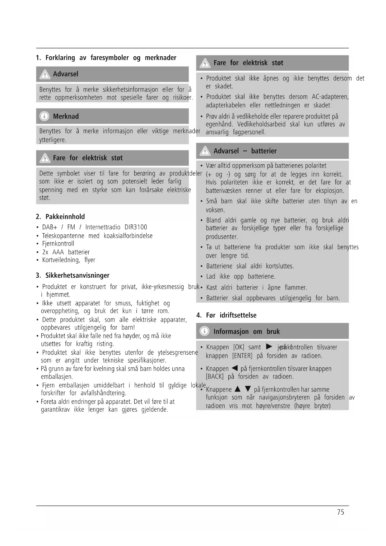 Ved første systemstart benytter radioen engelsk språk. Slik endrer du dette: Trykk [MENU] > Systemoppsett > Språk > Velge språk Bekreft ved å trykke på [ENTER] eller [OK]-knappen. Merknad Du kan velge følgende språk: Engelsk, tysk, dansk, nederlandsk, nsk, fransk, italiensk, norsk, polsk, portugisisk, spansk, svensk og tyrkisk77