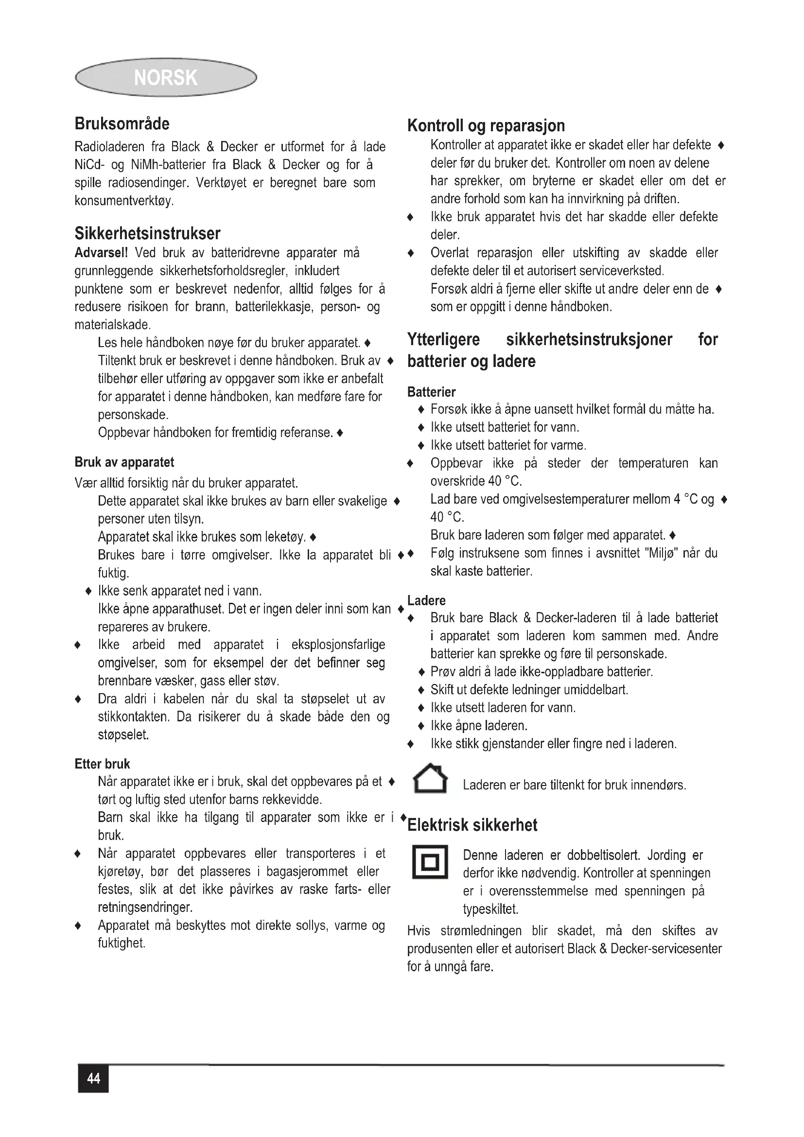 Norsk Bruksområde Radioladeren fra Black & Decker er utformet for å lade NiCd- og NiMh-batterier fra Black & Decker og for å spille radiosendinger. Verktøyet er beregnet bare som konsumentverktøy. Sikkerhetsinstrukser Advarsel! Ved bruk av batteridrevne apparater må grunnleggende sikkerhetsforholdsregler, inkludert punktene som er beskrevet nedenfor, alltid følges for å redusere risikoen for brann, batterilekkasje, person- og materialskade. Les hele håndboken nøye før du bruker apparatet. ♦ Tiltenkt bruk er beskrevet i denne håndboken. Bruk av ♦ tilbehør eller utføring av oppgaver som ikke er anbefalt for apparatet i denne håndboken, kan medføre fare for personskade. Oppbevar håndboken for fremtidig referanse. ♦ Bruk av apparatet Vær alltid forsiktig når du bruker apparatet. Dette apparatet skal ikke brukes av barn eller svakelige ♦ personer uten tilsyn. Apparatet skal ikke brukes som leketøy. ♦ Brukes bare i tørre omgivelser. Ikke la apparatet bli ♦ fuktig. Ikke senk apparatet ned i vann. ♦ Ikke åpne apparathuset. Det er ingen deler inni som kan ♦ repareres av brukere. Ikke arbeid med apparatet i eksplosjonsfarlige ♦ omgivelser, som for eksempel der det benner seg brennbare væsker, gass eller støv. Dra aldri i kabelen når du skal ta støpselet ut av ♦ stikkontakten. Da risikerer du å skade både den og støpselet. Etter bruk Når apparatet ikke er i bruk, skal det oppbevares på et ♦ tørt og luftig sted utenfor barns rekkevidde. Barn skal ikke ha tilgang til apparater som ikke er i ♦ bruk. Når apparatet oppbevares eller transporteres i et ♦ kjøretøy, bør det plasseres i bagasjerommet eller festes, slik at det ikke påvirkes av raske farts- eller retningsendringer. Apparatet må beskyttes mot direkte sollys, varme og ♦ fuktighet. Kontroll og reparasjon Kontroller at apparatet ikke er skadet eller har defekte ♦ deler før du bruker det. Kontroller om noen av delene har sprekker, om bryterne er skadet eller om det er andre forhold som kan ha innvirkning på driften. Ikke bruk apparatet hvis det har skadde eller defekte ♦ deler. Overlat reparasjon eller utskifting av skadde eller ♦ defekte deler til et autorisert serviceverksted. Forsøk aldri å fjerne eller skifte ut andre deler enn de ♦ som er oppgitt i denne håndboken. Ytterligere sikkerhetsinstruksjoner for batterier og ladere Batterier Forsøk ikke å åpne uansett hvilket formål du måtte ha. ♦ Ikke utsett batteriet for vann. ♦ Ikke utsett batteriet for varme. ♦ Oppbevar ikke på steder der temperaturen kan ♦ overskride 40 °C. Lad bare ved omgivelsestemperaturer mellom 4 °C og ♦ 40 °C. Bruk bare laderen som følger med apparatet. ♦ Følg instruksene som nnes i avsnittet "Miljø" når du ♦ skal kaste batterier. Ladere Bruk bare Black & Decker-laderen til å lade batteriet ♦ i apparatet som laderen kom sammen med. Andre batterier kan sprekke og føre til personskade. Prøv aldri å lade ikke-oppladbare batterier. ♦ Skift ut defekte ledninger umiddelbart. ♦ Ikke utsett laderen for vann. ♦ Ikke åpne laderen. ♦ Ikke stikk gjenstander eller ngre ned i laderen. ♦ Laderen er bare tiltenkt for bruk innendørs. Elektrisk sikkerhet Denne laderen er dobbeltisolert. Jording er derfor ikke nødvendig. Kontroller at spenningen er i overensstemmelse med spenningen på typeskiltet. Hvis strømledningen blir skadet, må den skiftes av produsenten eller et autorisert Black & Decker-servicesenter for å unngå fare. NORSK45 Funksjoner Dette apparatet inneholder noen av eller alle funksjonene nedenfor: Kontakt for vekselstrømadapter (baksiden av enheten)1. Ladeport (baksiden av enheten)2. Antenne3. Strøm på/av, volumkontroll4. Bassvelger5. Høyttaler6. Ladningsindikator7. AM/FM/AUX-velger8. Stasjonsvalgknapper9. Lokk til MP3-spiller10. Modusindikator11. Bassforsterkningsindikator12. Stasjonsfrekvens13. Vekselstrømadapter (ikke vist) Batteripakke (ikke inkludert) Bruk Informasjon om batterihetter Batterioppbevaring og transporthetter leveres for bruk når batteriet er utenfor verktøyet eller laderen. Fjern hetten før du plasserer batteriet i laderen eller verktøyet. Lade batteripakken Advarsel! Batterier skal ikke utsettes for sterk varme, for eksempel solskinn, ild eller lignende. Radioladeren skal bare brukes på et sted med god gjennomlufting. Radioladeren er utformet for å bruke standard husholdningsstrøm på 230 V AC. Sett pluggen på strømadapteren inn i radioladeren som ♦ vist i gur B. Kontroller at laderpluggen er plassert riktig i forhold til kontakten i radioen før du skyver den helt inn. Plugg strømadapteren inn i en standardkontakt med ♦ 230 V AC. MERK: Ikke utfør ladning med en motorgenerator eller likestrømskilde. Bruk bare 230 V vekselstrøm. Skyv batteripakken inn bak på enheten som vist i gur ♦ C. Kontroller at batteripakken sitter riktig i porten, og la pakken bli ladet 9 timer første gang. Etter første oppladning bør batteripakken ved normal bruk være fullt ladet etter 3 til 6 timer. Det gule ladelyset på radiofronten (gur D) lyser og ♦ viser at ladningsprosessen har begynt. Viktige merknader om ladning Ved normal bruk bør batteripakken være fullt ladet etter ♦ 3 til 6 timer. Hvis pakken er helt tom, tar det inntil 9 timer å lade den helt. Batteripakken ble sendt fra fabrikken i ikke-ladet tilstand. Før du prøver å bruke den, må du lade den i minst 9 timer. Du må IKKE lade batteripakken ved lufttemperatur ♦ under 4 °C eller over 40 °C. Dette er viktig og vil hindre alvorlig skade på batteripakken. Batteripakker får lengst levetid og best ytelse hvis de lades ved lufttemperatur omkring 25 °C. Under ladningen kan laderen brumme og bli varm å ta ♦ på. Dette er normalt og betyr ikke at noe er feil. Hvis batteripakken ikke blir ladet ordentlig: ♦ Kontroller strømmen i kontakten ved å sette inn en - lampe eller et annet apparat. Kontroller om kontakten er koblet til en lysbryter som - slår av