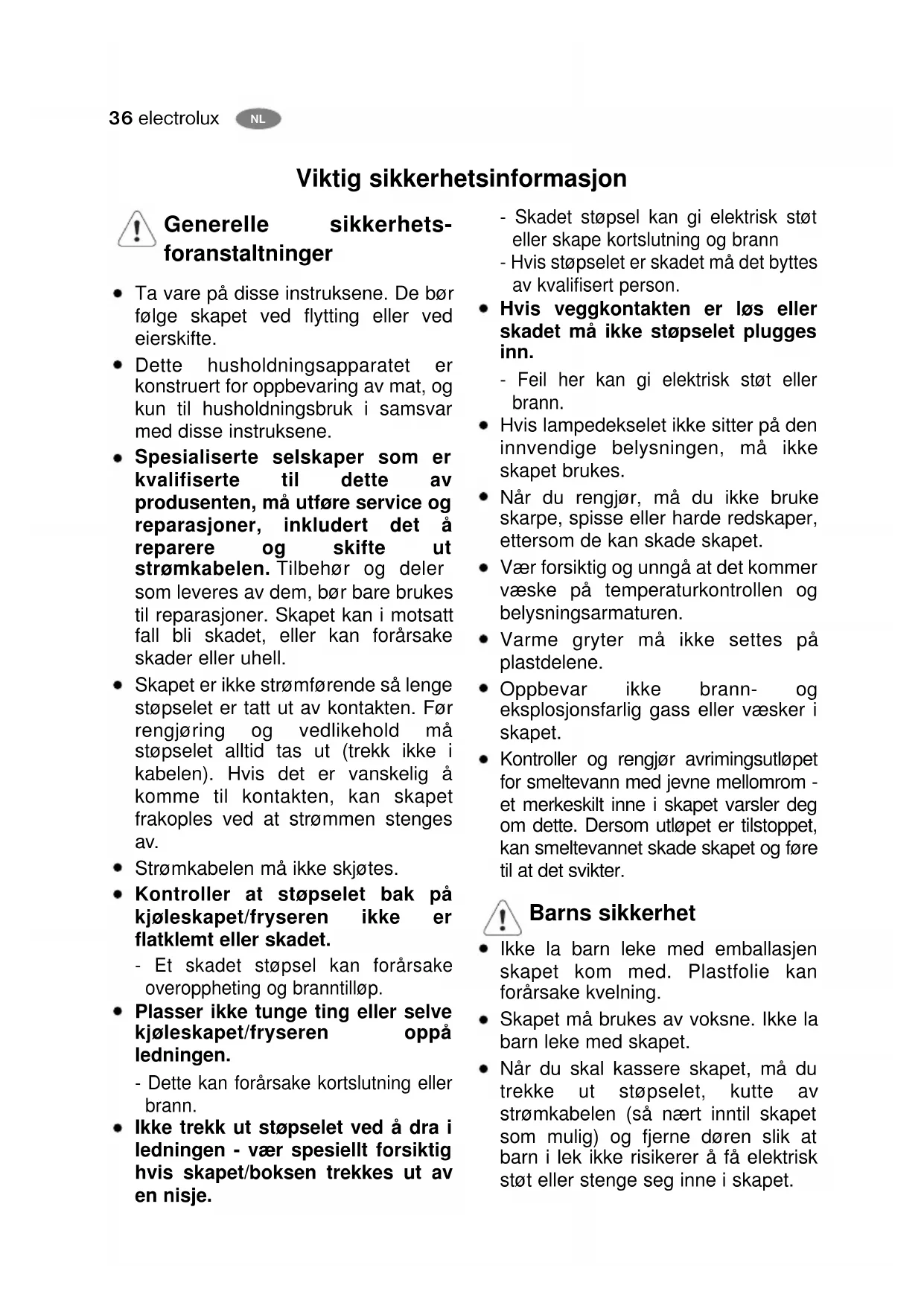 Generelle sikkerhets- foranstaltninger Ta vare på disse instruksene. De bør følge skapet ved flytting eller ved eierskifte. Dette husholdningsapparatet er konstruert for oppbevaring av mat, og kun til husholdningsbruk i samsvar med disse instruksene. Spesialiserte selskaper som er kvalifiserte til dette av produsenten, må utføre service og reparasjoner, inkludert det å reparere og skifte ut strømkabelen. Tilbehør og deler som leveres av dem, bør bare brukes til reparasjoner. Skapet kan i motsatt fall bli skadet, eller kan forårsake skader eller uhell. Skapet er ikke strømførende så lenge støpselet er tatt ut av kontakten. Før rengjøring og vedlikehold må støpselet alltid tas ut (trekk ikke i kabelen). Hvis det er vanskelig å komme til kontakten, kan skapet frakoples ved at strømmen stenges av. Strømkabelen må ikke skjøtes. Kontroller at støpselet bak på kjøleskapet/fryseren ikke er flatklemt eller skadet. - Et skadet støpsel kan forårsake overoppheting og branntilløp. Plasser ikke tunge ting eller selve kjøleskapet/fryseren oppå ledningen. - Dette kan forårsake kortslutning eller brann. Ikke trekk ut støpselet ved å dra i ledningen - vær spesiellt forsiktig hvis skapet/boksen trekkes ut av en nisje. - Skadet støpsel kan gi elektrisk støt eller skape kortslutning og brann - Hvis støpselet er skadet må det byttes av kvalifisert person. Hvis veggkontakten er løs eller skadet må ikke støpselet plugges inn. - Feil her kan gi elektrisk støt eller brann. Hvis lampedekselet ikke sitter på den innvendige belysningen, må ikke skapet brukes. Når du rengjør, må du ikke bruke skarpe, spisse eller harde redskaper, ettersom de kan skade skapet. Vær forsiktig og unngå at det kommer væske på temperaturkontrollen og belysningsarmaturen. Varme gryter må ikke settes på plastdelene. Oppbevar ikke brann- og eksplosjonsfarlig gass eller væsker i skapet. Kontroller og rengjør avrimingsutløpet for smeltevann med jevne mellomrom - et merkeskilt inne i skapet varsler deg om dette. Dersom utløpet er tilstoppet, kan smeltevannet skade skapet og føre til at det svikter. Barns sikkerhet Ikke la barn leke med emballasjen skapet kom med. Plastfolie kan forårsake kvelning. Skapet må brukes av voksne. Ikke la barn leke med skapet. Når du skal kassere skapet, må du trekke ut støpselet, kutte av strømkabelen (så nært inntil skapet som mulig) og fjerne døren slik at barn i lek ikke risikerer å få elektrisk støt eller stenge seg inne i skapet. Viktig sikkerhetsinformasjon NOelectrolux 37