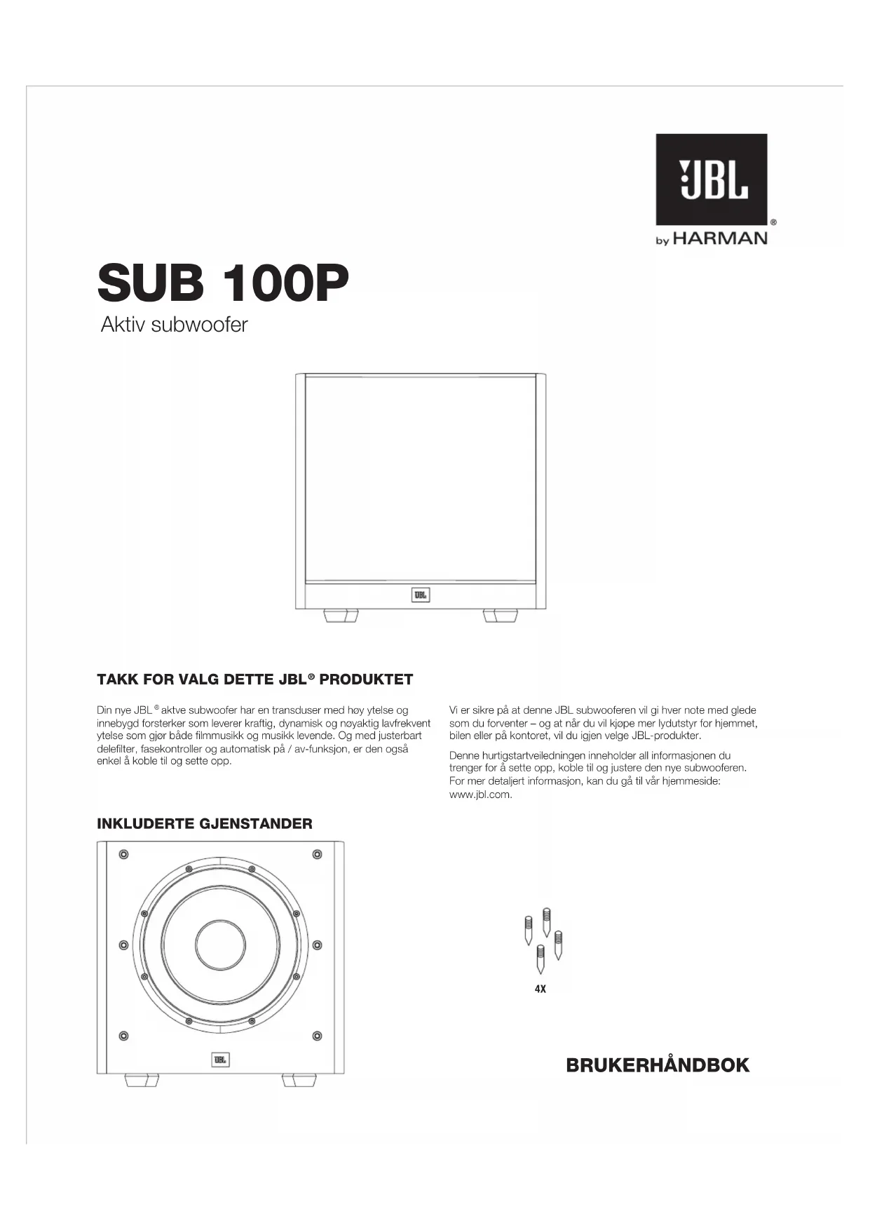 aktve subwoofer har en transduser med høy ytelse og innebygd forsterker som leverer kraftig, dynamisk og nøyaktig lavfrekvent ytelse som gjør både filmmusikk og musikk levende. Og med justerbart delefilter, fasekontroller og automatisk på / av-funksjon, er den også enkel å koble til og sette opp. Vi er sikre på at denne JBL subwooferen vil gi hver note med glede som du forventer – og at når du vil kjøpe mer lydutstyr for hjemmet, bilen eller på kontoret, vil du igjen velge JBL-produkter. Denne hurtigstartveiledningen inneholder all informasjonen du trenger for å sette opp, koble til og justere den nye subwooferen. For mer detaljert informasjon, kan du gå til vår hjemmeside: www.jbl.com. Aktiv subwoofer