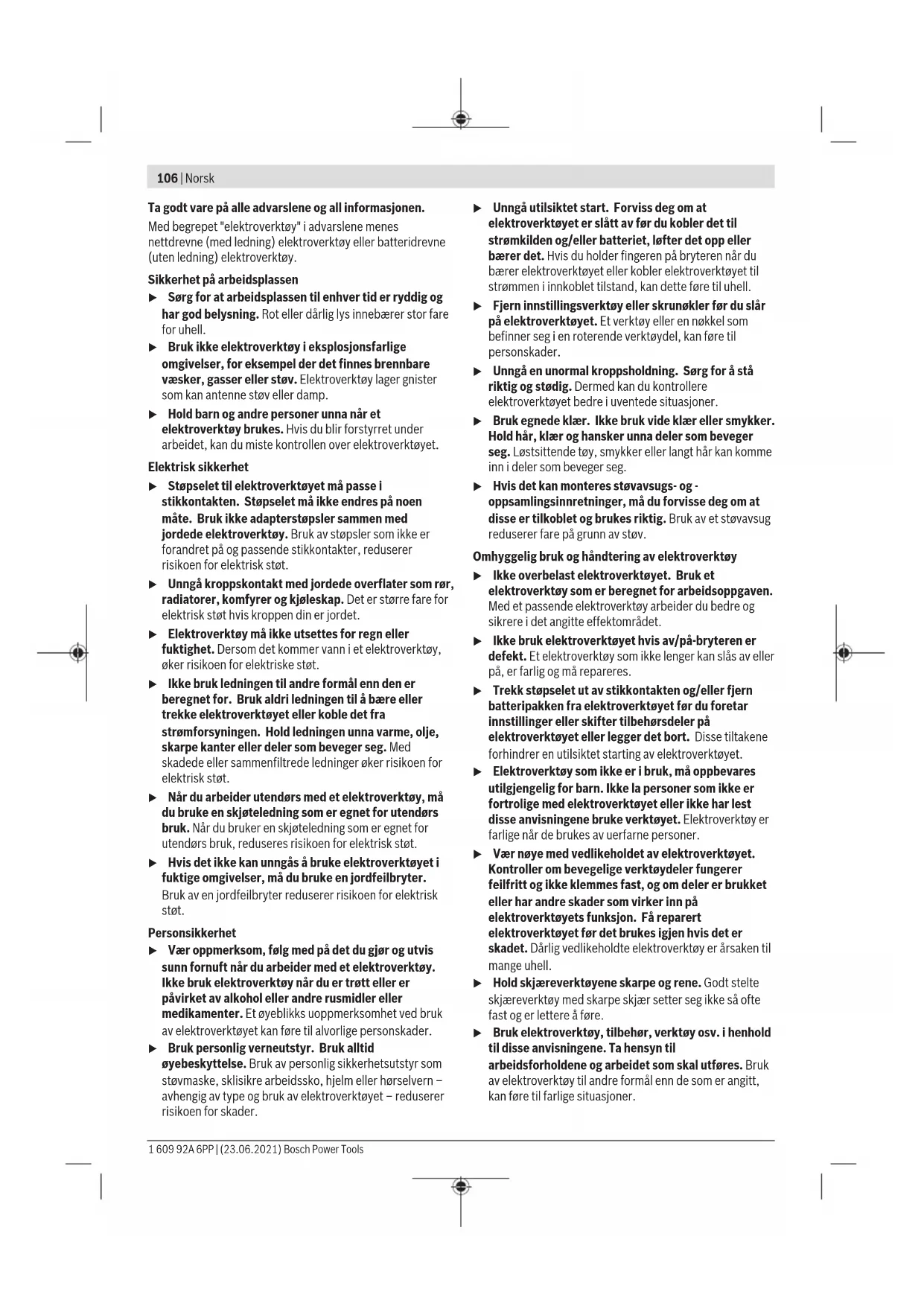 1,5 Vibrasjonsverdien som er angitt i disse anvisningene er målt iht. en standardisert målemetode og kan brukes til sammenligning av elektroverktøy med hverandre. Det egner seg også til en foreløpig vurdering av vibrasjonsbelastningen. Det angitte vibrasjonsnivået representerer de hovedsakelige anvendelsene til elektroverktøyet. Hvis elektroverktøyet brukes til andre oppgaver, med avvikende innsatsverktøy eller utilstrekkelig vedlikehold, kan imidlertid vibrasjonsnivået avvike. Dette kan føre til en betydelig økning av vibrasjonsbelastningen over hele arbeidstidsrommet. Til en nøyaktig vurdering av vibrasjonsbelastningen skal det også tas hensyn til de tidene maskinen er slått av eller går, men ikke virkelig brukes. Dette kan tydelig redusere vibrasjonsbelastningen over hele arbeidstidsrommet. Bestem ekstra sikkerhetstiltak til beskyttelse av brukeren mot vibrasjonenes virkning, som for eksempel: Vedlikehold av elektroverktøy og innsatsverktøy, holde hendene varme, organisere arbeidsforløpene. Montering Montere verneinnretning u Før alle arbeider på elektroverktøyet utføres må støpselet trekkes ut av stikkontakten. Merknad: Etter brudd på slipeskiven under drift eller skader på festeinnretningene på vernedekselet/elektroverktøyet må elektroverktøyet omgående sendes inn til kundeservice. Adresser se avsnittet "Kundeservice og kundeveiledning". Bosch Power Tools 1 609 92A 6PP | (23.06.2021)112 | Norsk Vernedeksel for sliping Legg vernedekselet (8) på festet på elektroverktøyet. Kodetappene på vernedekselet skal stemme overens med festet. Mens du gjør dette, trykker du på utløserspaken (1) og holder den inne. Trykk vernedekselet (8) på spindelhalsen helt til kragen på vernedekselet sitter på flensen til elektroverktøyet, og drei vernedekselet til det høres at det festes. Tilpass plasseringen av vernedekselet (8) etter arbeidsoperasjonen. Dette gjør du ved å trykke utløserspaken (1) opp og dreie vernedekselet (8) til ønsket stilling. u Still alltid inn vernedekselet (8) slik at begge tappene på utløserspaken (1) griper inn i de tilsvarende utsparingene til vernedekselet (8) . u Still inn vernedekselet (8) slik at gnistregn i retning brukeren unngås. u Vernedekselet (8) skal bare kunne dreies ved aktivering av utløserspaken (1) ! Ellers må elektroverktøyet ikke brukes videre og må leveres til kundeservice. Merknad: Kodetappene på vernedekselet (8) sikrer at bare et vernedeksel som passer til elektroverktøyet, kan monteres. Støvavsugsdeksel for sliping Ved sliping av maling, lakk og plast ved bruk av hardmetall- koppskiver (11) kan du bruke støvavsugsdekselet (7), slik at lite støv slippes ut i omgivelsene. Støvavsugsdekselet (7) er ikke egnet for bearbeiding av metall. En egnet støvsuger fra Bosch kan kobles til støvavsugsdekselet (7). Støvavsugsdekselet (7) monteres som vernedekselet (8). Børsteringen kan skiftes ut. Vernedeksel for kapping u Ved kapping med bundne slipemidler må du alltid bruke vernedekselet for kapping (9). u Sørg for tilstrekkelig støvavsug ved kapping i stein. Vernedekselet for kapping (9) monteres som vernedekselet for sliping (8). Støvavsugsdeksel for kapping med styreskinner Avsugshetten for kapping med styreskinner(19) monteres som vernedekselet for sliping. Håndbeskyttelse u Monter alltid håndbeskyttelsen når du skal arbeide med gummislipeskiven (22) eller koppbørsten/ skivebørsten/lamellslipeskiven (21). Fest håndbeskyttelsen (21) med ekstrahåndtaket (6). Ekstrahåndtak u Du må ikke bruke elektroverktøyet uten ekstrahåndtaket (6). Skru fast ekstrahåndtaket (6) til høyre eller venstre på girhodet, avhengig av hvordan du arbeider. Vibrasjonsdempende ekstrahåndtak Det vibrasjonsdempende ekstrahåndtaket gir mulighet til sikrere og mer komfortabelt arbeid med lite vibrasjoner. u Du må aldri endre på ekstrahåndtaket. Ekstrahåndtaket må ikke brukes hvis det er skadet. Montere slipeverktøy u Før alle arbeider på elektroverktøyet utføres må støpselet trekkes ut av stikkontakten. u Ikke berør slipe- og kappeskiver før de er avkjølt. Skivene blir svært varme under arbeidet. Rengjør slipespindelen (18)og alle delene som skal monteres. Trykk på spindellåseknappen (2) for å låse slipespindelen når du skal spenne fast og løsne slipeverktøyet. u Trykk på spindellåseknappen bare når slipespindelen er stanset. Elektroverktøyet kan ta skade hvis det velter. Slipe-/kappeskive Vær oppmerksom på målene til slipeverktøyet. Hulldiameteren må passe til festeflensen. Bruk ikke adaptere eller reduksjonsstykker. Ved bruk av diamantkappeskiver må du passe på at rotasjonsretningspilen på diamantkappeskiven og elektroverktøyets rotasjonsretning (se rotasjonsretningspil på girhodet) stemmer overens. Monteringsrekkefølgen vises på siden med illustrasjoner. For å feste slipe-/kappeskiven skrur du på spennmutteren (15) og strammer den med tohullsnøkkelen (se „ Hurtigspennmutter “, Side113). u Etter montering av slipeverktøyet og før innkoblingen må du sjekke om slipeverktøyet er korrekt montert og kan dreies fritt. Pass på at slipeverktøyet ikke kommer borti vernedekselet eller andre deler. En plastdel (o-ring) er satt inn rundt sentreringskragen i festeflensen (10). Hvis o- ringen mangler eller er skadet, må festeflensen (10) skiftes ut før videre bruk. Lamellslipeskive u Monter alltid håndbeskyttelsen når du skal arbeide med lamellslipeskiven (21). Gummislipeskive u Monter alltid håndbeskyttelsen (21) når du skal arbeide med gummislipeskiven (22). Monteringsrekkefølgen vises på siden med illustrasjoner. 1 609 92A 6PP | (23.06.2021) Bosch Power ToolsNorsk | 113 Skru på rundmutteren (24), og stram den med tohullsnøkkelen. Koppbørste/skivebørste u Monter alltid håndbeskyttelsen når du skal arbeide med koppbørsten eller skivebørsten (21). Monteringsrekkefølgen vises på siden med illustrasjoner. Koppbørsten/skivebørsten må kunne skrus så langt p