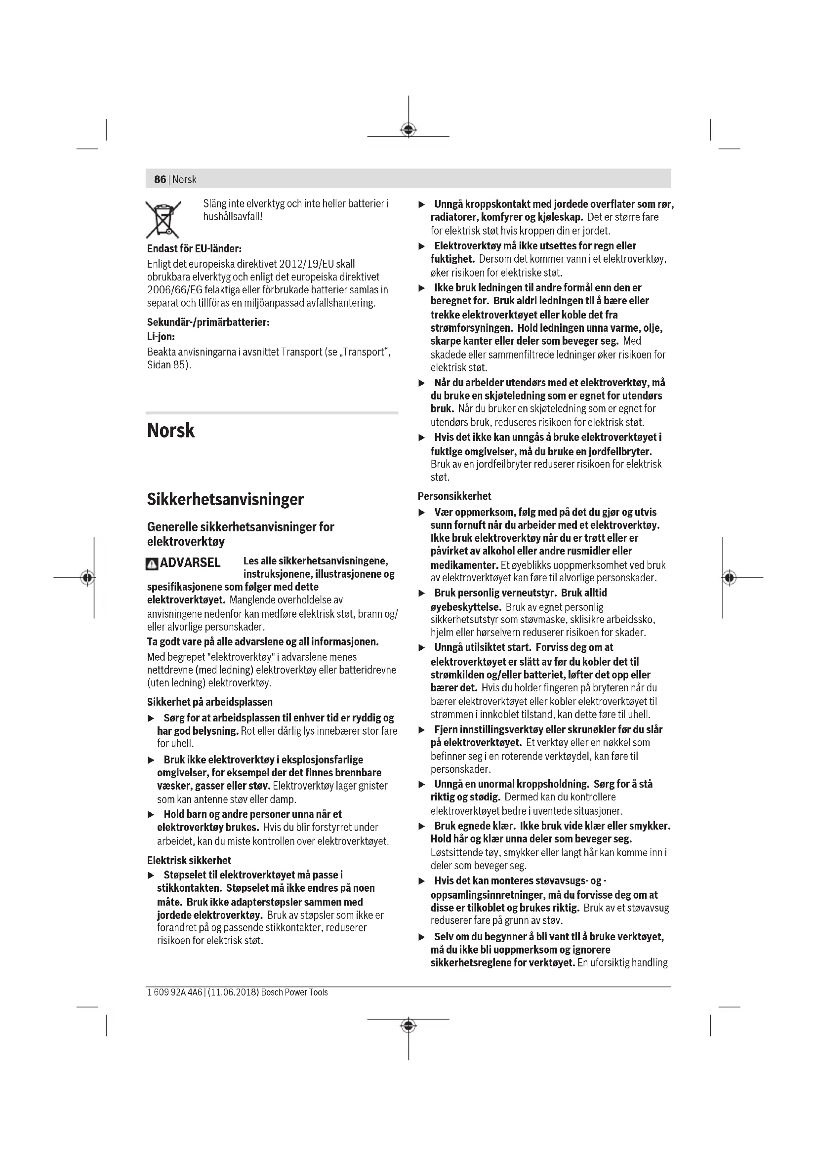 og ved lagring °C −20...+50 Anbefalte batterier GBA12V… Anbefalte ladere GAL12... GAX18... A) Avhengig av batteriet B) Begrenset ytelse ved temperatur under 0°C Tekniske data beregnet med batteri fra standardleveransen. Støy-/vibrasjonsinformasjon Støyemisjon målt i henhold til EN62841-2-11. Vanlig A-lydtrykknivå for elektroverktøyet er 70dB(A). Usikkerhet K = 5dB. Under arbeid kan støynivået overskride 80dB(A). Bruk hørselvern! Vibrasjon totalt a