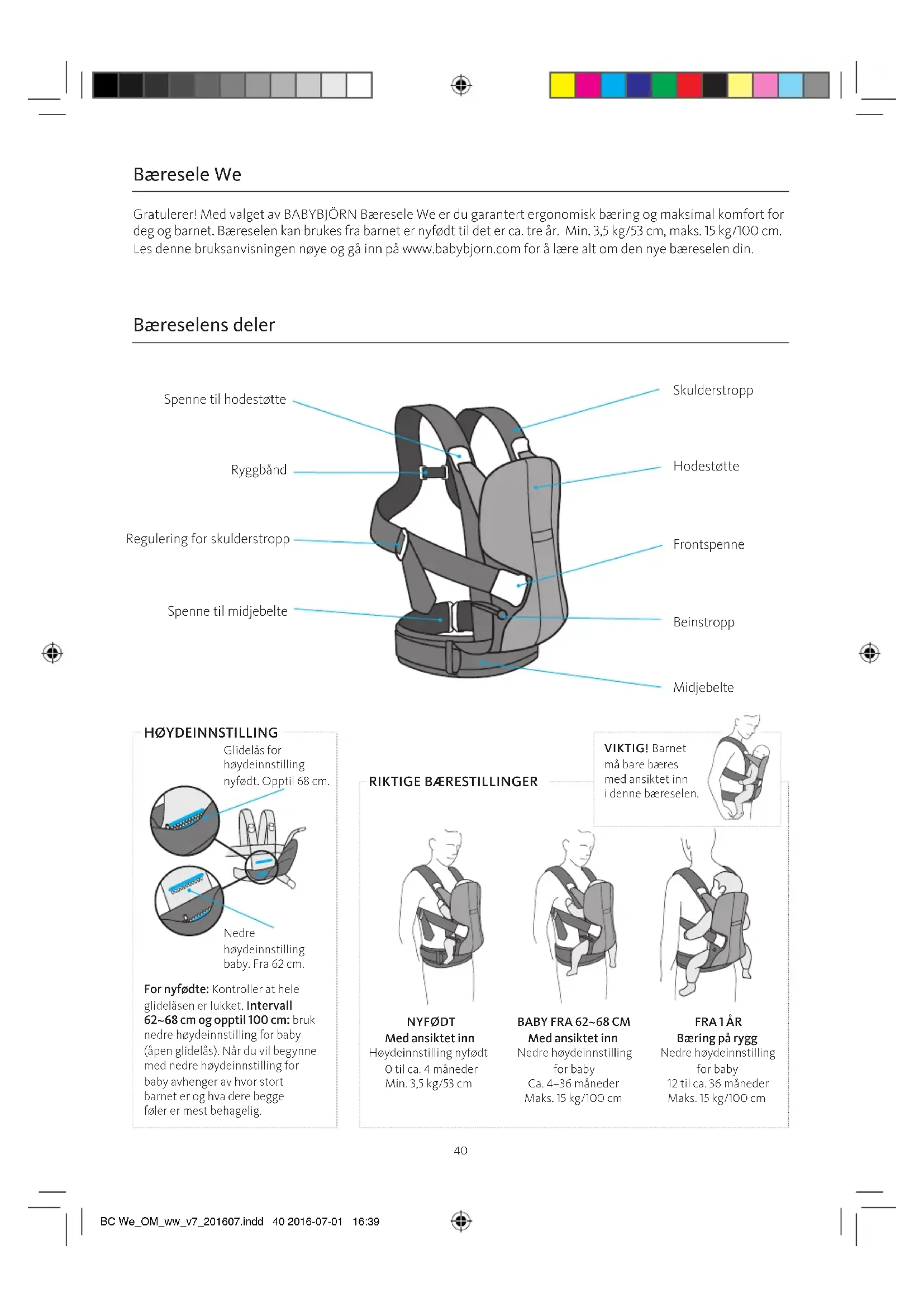 Med ansiktet inn Nedre høydeinnstilling for baby Ca. 4–36 måneder Maks. 15 kg/100 cm FRA 1 ÅR Bæring på rygg Nedre høydeinnstilling for baby 12 til ca. 36 måneder Maks. 15 kg/100 cm BC We_OM_ww_v7_201607.indd 40 2016-07-01 16:3940