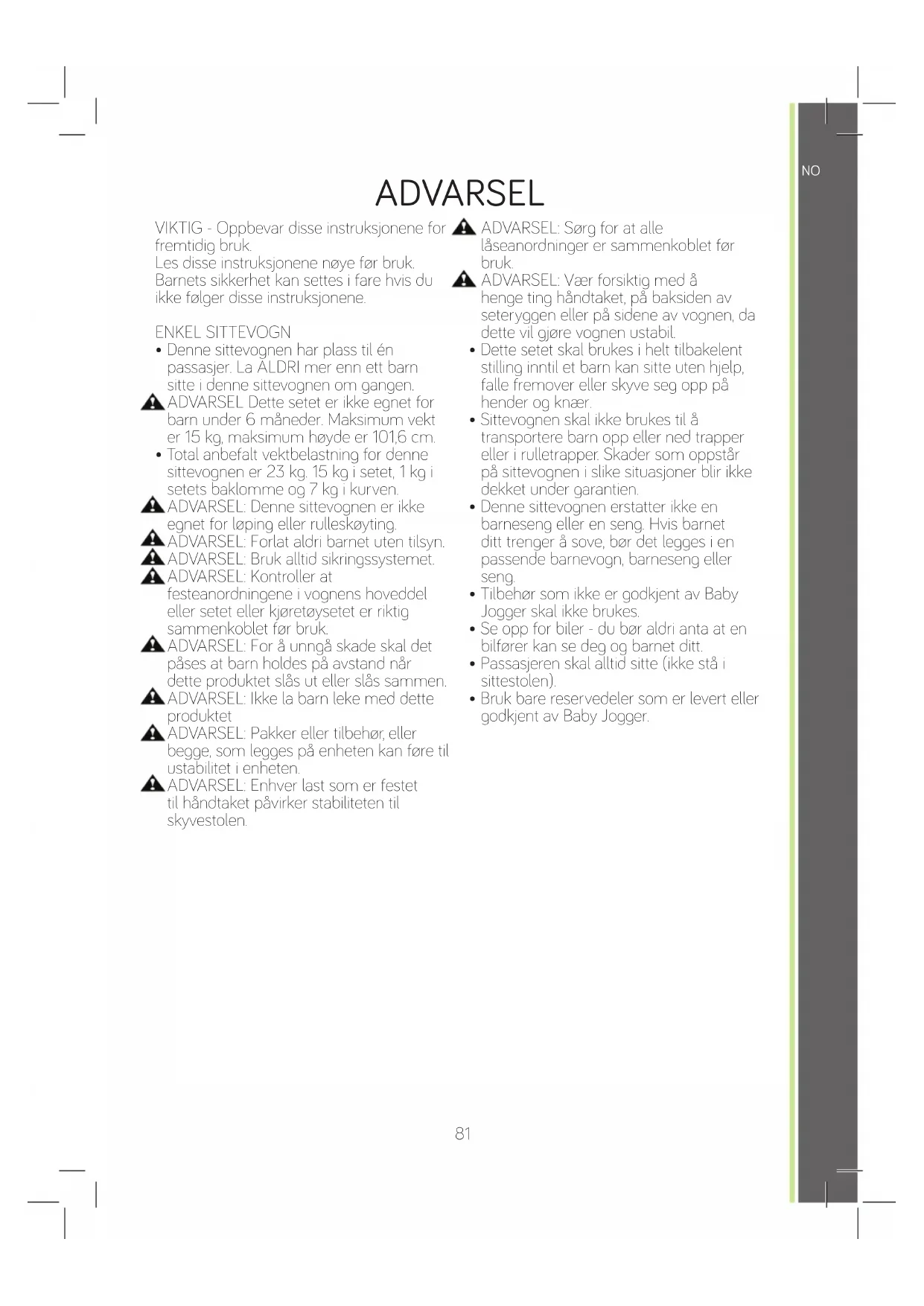 NO81 1 Håndtak 11 Utløserknapp for fronthjul 2 Justeringsknapp for håndtak 12 Fotrom 3 Parkeringsbremse 13 Selespenne 4 Setemonteringsbrakett 14 Seleputer 5 Utløserknapp for bakhjul 15 Oppbevaringslås 6 Bakhjul 16 Kalesje 7 Oppbevaringskurv 17 Knapp for tilbakevipping av sete 8 Justeringsknapp for fotrom 18 Knapp for setebretting 9 Bakhjul 19 Monteringsspor for tilbehør 10 Svingledd/lås ADVARSEL VIKTIG - Oppbevar disse instruksjonene for fremtidig bruk. Les disse instruksjonene nøye før bruk. Barnets sikkerhet kan settes i fare hvis du ikke følger disse instruksjonene. ENKEL SITTEVOGN