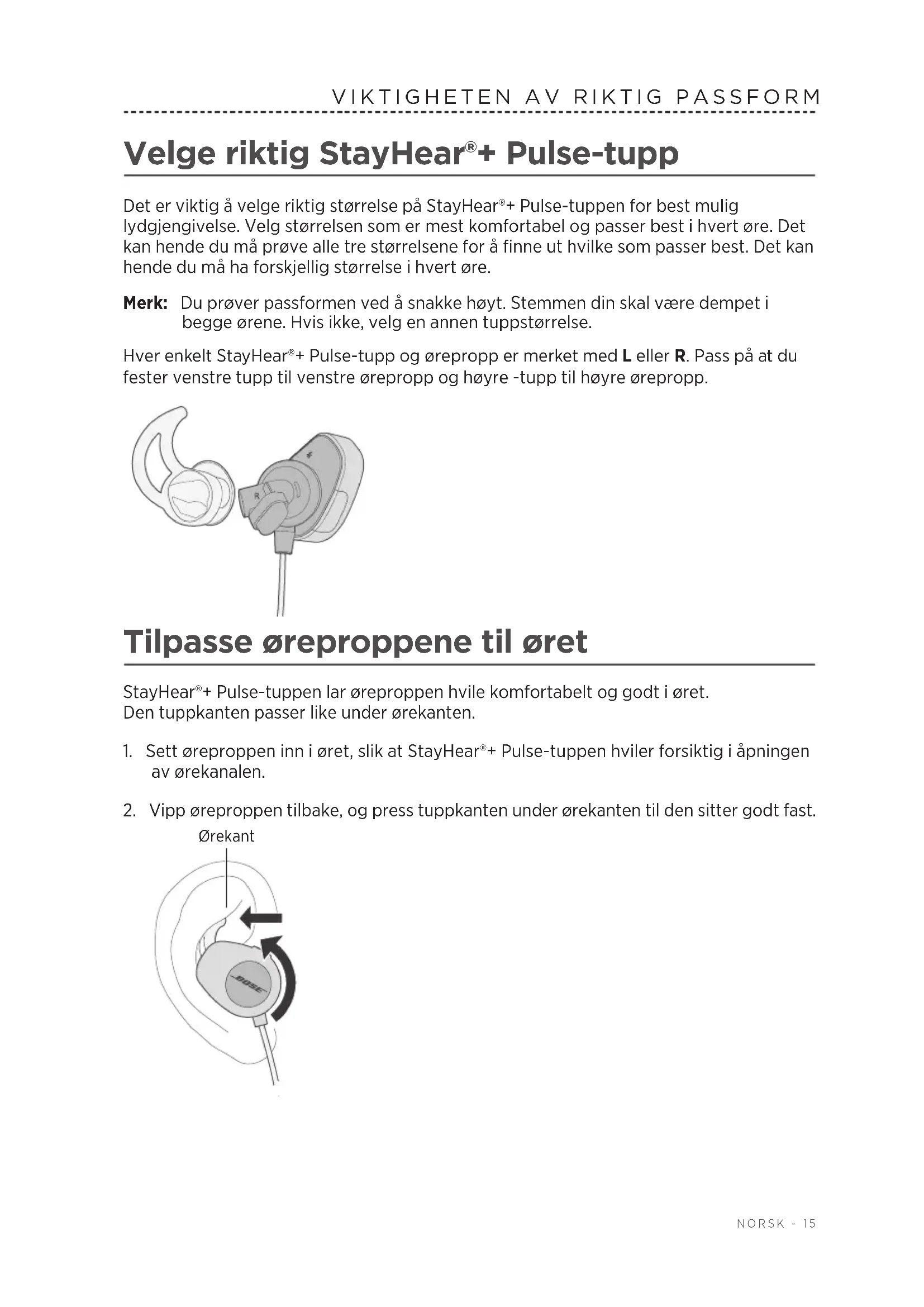 Velge riktig StayHear®+ Pulse-tupp Det er viktig å velge riktig størrelse på StayHear®+ Pulse-tuppen for best mulig lydgjengivelse. Velg størrelsen som er mest komfortabel og passer best i hvert øre. Det kan hende du må prøve alle tre størrelsene for å finne ut hvilke som passer best. Det kan hende du må ha forskjellig størrelse i hvert øre. Merk: Du prøver passformen ved å snakke høyt. Stemmen din skal være dempet i begge ørene. Hvis ikke, velg en annen tuppstørrelse. Hver enkelt StayHear®+ Pulse-tupp og ørepropp er merket med L eller R. Pass på at du fester venstre tupp til venstre ørepropp og høyre -tupp til høyre ørepropp. Tilpasse øreproppene til øret StayHear®+ Pulse-tuppen lar øreproppen hvile komfortabelt og godt i øret. Dentuppkanten passer like under ørekanten.