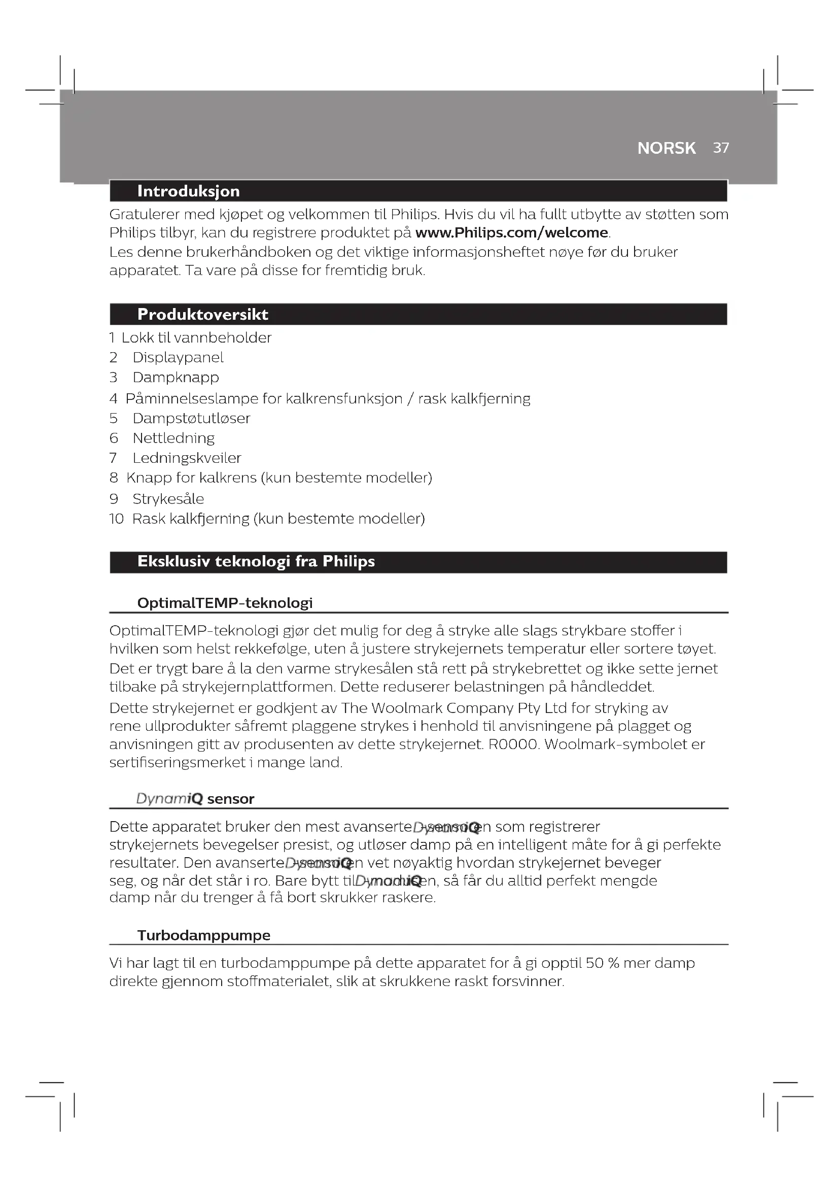 Bruke apparatet Merk: Strykejernet kan avgi litt røyk når du bruker det for første gang. Dette gir seg etter en liten stund. Hvilken type vann skal brukes Dette apparatet er utformet for bruk med springvann. Hvis du bor i et område med hardt vann, kan det raskt danne seg mye kalk. Derfor anbefaler vi at du bruker destillert eller avsaltet vann for å forlenge levetiden til apparatet. Ikke bruk parfymert vann, vann fra en tørketrommel, eddik, stivelse, avkalkingsmidler, strykemidler, kjemisk avkalket vann eller andre kjemikalier, ettersom dette kan føre til vannsprut, brune ekker eller skade på apparatet. Stoer som kan strykes 1 Sjekk om plagget kan strykes, ved å lese etiketten på plagget (g. 1-3). Ikke stryk stoer som ikke kan strykes. Trykk på plagget kan heller ikke strykes. Dampinnstillinger 1 For å endre dampinnstilling vipper du strykejernet litt opp (ca. 20 grader og mer) og trykker på dampknappen oppå håndtaket (g. 1-5) Merk: Alle dampinnstillingene er utstyrt med OptimalTEMP-teknologi og kan trygt brukes på alle stoer som kan strykes. - ( -innstillingen) (g. 1-6): aktiveres av -sensoren, perfekt mengde damp produseres automatisk ved behov når strykejernet er i bevegelse. Dampen stopper opp når strykejernet ikke yttes eller settes i vertikal posisjon. Det anbefales at du bruker -innstillingen for full brukervennlighet på alle plagg. - (MAX-innstillingen) (g. 1-7): Maksimal konstant damp avgis kontinuerlig for vanskelige skrukker. For å få best mulig resultat på vanskelige stoer som bomull, jeans og lin anbefales det å bruke MAX-innstillingen. Dampen stopper opp når strykejernet settes i vertikal posisjon. - (ECO-innstillingen) (kun bestemte modeller) (g. 1-8): Minimal konstant damp avgis kontinuerlig for plagg med færre skrukker. Denne innstillingen sparer også energi. Dampen stopper opp når strykejernet settes i vertikal posisjon. - (ionisk innstilling) (kun bestemte modeller) (g. 1-9): Dype og kraftige ioniske dampstøt produseres for mer hygienisk stryking. - (damp av-innstilling) (g. 1-10): Velg denne innstillingen hvis du vil stryke uten damp. Tips: I hvilken som helst dampinnstilling kan du trykke på dampknappen under strykingen for å få mer damp. Slår seg automatisk av Sikkerhetsfunksjonen for automatisk avslåing slår automatisk av apparatet hvis det ikke har vært i bruk på mer enn 2 minutter mens det står på strykesålen, eller 8 minutter mens det står oppreist. Displaypanelet blinker for å vise at apparatet er i statusen for automatisk avslåing. Hvis du vil at apparatet skal varmes opp igjen, løfter du det eller beveger litt på det. Displaypanelet begynner å pulsere, og apparatet begynner å varmes opp.NORSK
