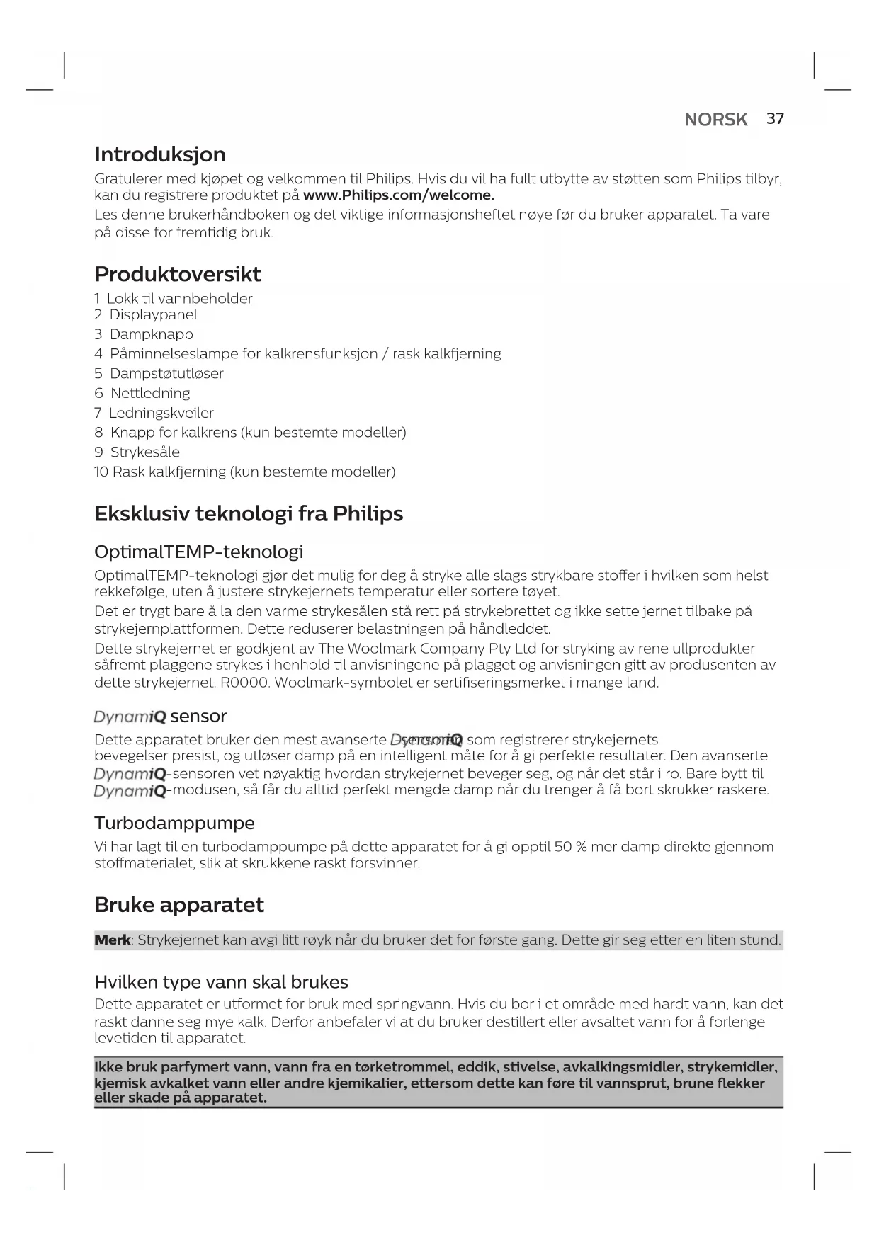 suomiIntroduksjon Gratulerer med kjøpet og velkommen til Philips. Hvis du vil ha fullt utbytte av støtten som Philips tilbyr, kan du registrere produktet på www.Philips.com/welcome. Les denne brukerhåndboken og det viktige informasjonsheftet nøye før du bruker apparatet. Ta vare på disse for fremtidig bruk. Produktoversikt 1 Lokk til vannbeholder 2 Displaypanel 3 Dampknapp 4 Påminnelseslampe for kalkrensfunksjon / rask kalkfjerning 5 Dampstøtutløser 6 Nettledning 7 Ledningskveiler 8 Knapp for kalkrens (kun bestemte modeller) 9 Strykesåle 10 Rask kalkfjerning (kun bestemte modeller) Eksklusiv teknologi fra Philips OptimalTEMP-teknologi OptimalTEMP-teknologi gjør det mulig for deg å stryke alle slags strykbare stoer i hvilken som helst rekkefølge, uten å justere strykejernets temperatur eller sortere tøyet. Det er trygt bare å la den varme strykesålen stå rett på strykebrettet og ikke sette jernet tilbake på strykejernplattformen. Dette reduserer belastningen på håndleddet. Dette strykejernet er godkjent av The Woolmark Company Pty Ltd for stryking av rene ullprodukter såfremt plaggene strykes i henhold til anvisningene på plagget og anvisningen gitt av produsenten av dette strykejernet. R0000. Woolmark-symbolet er sertiseringsmerket i mange land. sensor Dette apparatet bruker den mest avanserte -sensoren som registrerer strykejernets bevegelser presist, og utløser damp på en intelligent måte for å gi perfekte resultater. Den avanserte -sensoren vet nøyaktig hvordan strykejernet beveger seg, og når det står i ro. Bare bytt til -modusen, så får du alltid perfekt mengde damp når du trenger å få bort skrukker raskere. Turbodamppumpe Vi har lagt til en turbodamppumpe på dette apparatet for å gi opptil 50 % mer damp direkte gjennom stomaterialet, slik at skrukkene raskt forsvinner. Bruke apparatet Merk: Strykejernet kan avgi litt røyk når du bruker det for første gang. Dette gir seg etter en liten stund. Hvilken type vann skal brukes Dette apparatet er utformet for bruk med springvann. Hvis du bor i et område med hardt vann, kan det raskt danne seg mye kalk. Derfor anbefaler vi at du bruker destillert eller avsaltet vann for å forlenge levetiden til apparatet. Ikke bruk parfymert vann, vann fra en tørketrommel, eddik, stivelse, avkalkingsmidler, strykemidler, kjemisk avkalket vann eller andre kjemikalier, ettersom dette kan føre til vannsprut, brune ekker eller skade på apparatet.