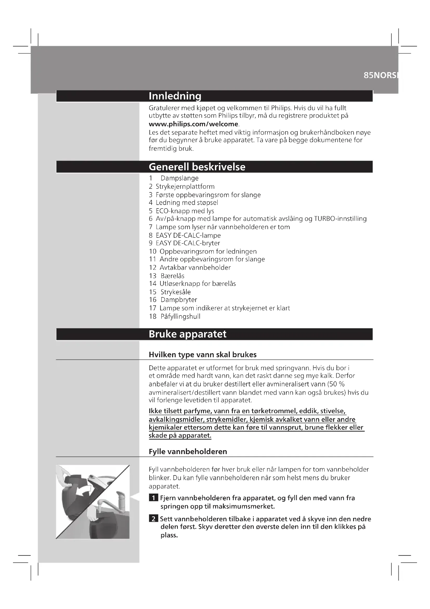 Last ned instruksjonene for din Strykejern i PDF-format gratis! Finn veiledningen din PerfectCare Elite Silence GC9646 - PHILIPS og ta den elektroniske enheten tilbake i hendene. På denne siden er alle dokumenter som er nødvendige for bruken av enheten din publisert. PerfectCare Elite Silence GC9646 av merket PHILIPS.