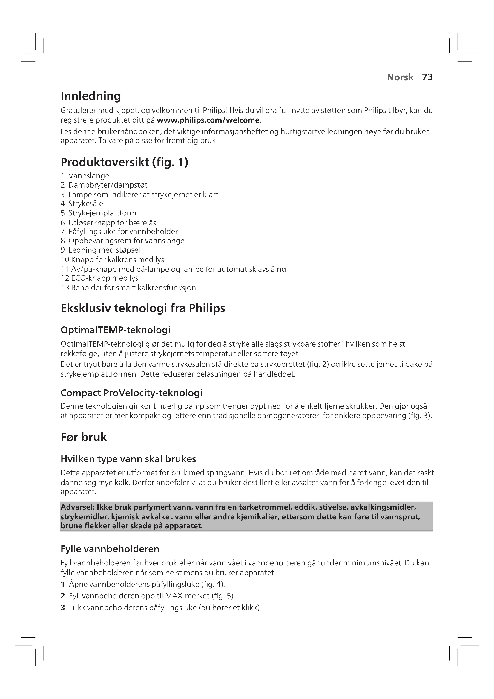 Προσθέστε ένα επιπλέον στρώμα τσόχας κάτω από το κάλυμμα της σιδερώστρας, για να εμποδίσετε την υγροποίηση του ατμού πάνω στη σιδερώστρα. Ελληνικα73 Innledning Gratulerer med kjøpet, og velkommen til Philips! Hvis du vil dra full nytte av støtten som Philips tilbyr, kan du registrere produktet ditt på www.philips.com/welcome. Les denne brukerhåndboken, det viktige informasjonsheftet og hurtigstartveiledningen nøye før du bruker apparatet. Ta vare på disse for fremtidig bruk. Produktoversikt (g. 1) 1 Vannslange 2 Dampbryter/dampstøt 3 Lampe som indikerer at strykejernet er klart 4 Strykesåle 5 Strykejernplattform 6 Utløserknapp for bærelås 7 Påfyllingsluke for vannbeholder 8 Oppbevaringsrom for vannslange 9 Ledning med støpsel 10 Knapp for kalkrens med lys 11 Av/på-knapp med på-lampe og lampe for automatisk avslåing 12 ECO-knapp med lys 13 Beholder for smart kalkrensfunksjon Eksklusiv teknologi fra Philips OptimalTEMP-teknologi OptimalTEMP-teknologi gjør det mulig for deg å stryke alle slags strykbare stoer i hvilken som helst rekkefølge, uten å justere strykejernets temperatur eller sortere tøyet. Det er trygt bare å la den varme strykesålen stå direkte på strykebrettet (g. 2) og ikke sette jernet tilbake på strykejernplattformen. Dette reduserer belastningen på håndleddet. Compact ProVelocity-teknologi Denne teknologien gir kontinuerlig damp som trenger dypt ned for å enkelt fjerne skrukker. Den gjør også at apparatet er mer kompakt og lettere enn tradisjonelle dampgeneratorer, for enklere oppbevaring (g. 3). Før bruk Hvilken type vann skal brukes Dette apparatet er utformet for bruk med springvann. Hvis du bor i et område med hardt vann, kan det raskt danne seg mye kalk. Derfor anbefaler vi at du bruker destillert eller avsaltet vann for å forlenge levetiden til apparatet. Advarsel: Ikke bruk parfymert vann, vann fra en tørketrommel, eddik, stivelse, avkalkingsmidler, strykemidler, kjemisk avkalket vann eller andre kjemikalier, ettersom dette kan føre til vannsprut, brune ekker eller skade på apparatet. Fylle vannbeholderen Fyll vannbeholderen før hver bruk eller når vannivået i vannbeholderen går under minimumsnivået. Du kan fylle vannbeholderen når som helst mens du bruker apparatet. 1 Åpne vannbeholderens påfyllingsluke (g. 4). 2 Fyll vannbeholderen opp til MAX-merket (g. 5). 3 Lukk vannbeholderens påfyllingsluke (du hører et klikk). Norsk74 Bruke apparatet Stoer som kan strykes Ikke stryk stoer som ikke kan strykes. - Du kan stryke stoer med disse symbolene (g. 6), for eksempel lin, bomull, polyester, silke, ull, viskose og rayon. - Du kan ikke stryke stoer med dette symbolet (g. 7). Dette gjelder syntetiske stoer som Spandex eller elastan, stoer med Spandex og polyolener (f.eks. polypropylen). Trykk på plagget kan heller ikke strykes. Stryking 1 Plasser dampgeneratoren på en stabil, jevn overate. Merk: Vi anbefaler at du alltid plasserer sokkelen på et stabilt strykebrett, slik at du kan stryke trygt. 2 Kontroller at det er nok vann i vannbeholderen. 3 Sett strømstøpselet i en jordet stikkontakt, og trykk på av/på-knappen for å slå på dampgeneratoren. Vent til lampen som indikerer at strykejernet er klart, lyser kontinuerlig (Fig. 8). Det tar ca. 2minutter. 4 Ta ut vanntilførselsslangen fra oppbevaringsrommet for vanntilførselsslangen. 5 Trykk på utløserknappen for bærelås for å løsne strykejernet fra strykejernplattformen (g. 9). 6 Trykk på og hold nede dampbryteren for å starte strykingen (g. 10). 7 Når du har strøket med damp, bør du stryke de siste gangene uten damp for å få best resultat. Advarsel: Du må aldri rette damp mot mennesker. Merk: Når du bruker apparatet for første gang, kan det ta 30 sekunder før det kommer damp ut av apparatet. Merk: Pumpen blir aktivert hver gang du trykker på dampbryteren. Den gir fra seg en svak ranglelyd. Dette er normalt. Når det ikke er vann i vannbeholderen, er lyden fra pumpen høyere. Fyll opp vannbeholderen med vann når vannivået faller under minimumsnivået. Hvis du vil ha kraftigere damp, kan du bruke TURBO-dampmodusen, som er trygg å bruke på alle stoer som kan strykes. For stoer som bomull, jeans og lin anbefales det at du bruker TURBO-dampmodusen. 1 Trykk på og hold nede av/på-knappen i to sekunder til lampen blir hvit. 2 For å deaktivere TURBO-modusen trykker du på og holder av/på-knappen nede igjen i to sekunder til lampen blir blå. Dampstøtfunksjon Bruk dampstøtfunksjonen for å fjerne vanskelige skrukker. 1 Trykk på dampbryteren raskt to ganger (Fig. 11). Vertikal stryking Advarsel: Det kommer varm damp ut av strykejernet. Prøv aldri å fjerne skrukker fra et plagg mens noen har det på seg (g. 12). Ikke bruk damp i nærheten av dine egne eller noen andres hender. Du kan også bruke dampstrykejernet i vertikal stilling for å fjerne skrukker fra opphengte klær. 1 Hold strykejernet i vertikal posisjon, trykk på dampbryteren, og berør plagget lett med strykesålen mens du beveger strykejernet opp og ned (g. 13). Norsk75 Sikker bruk Plassere strykejernet mens du justerer plagget Når du justerer plagget, kan du la strykejernet stå på strykejernplattformen eller rett på strykebrettet (g.2). OptimalTEMP-teknologien sørger for at strykesålen ikke skader trekket på strykebrettet. Energibesparende Eco-modus Ved hjelp av ECO-modusen (mindre damp) kan du spare strøm uten at det går utover strykeresultatet. 1 For å aktivere ECO-modusen trykker du på ECO-knappen (g. 14). Den grønne ECO-lampen slås på. 2 For å deaktivere ECO-modusen trykker du på ECO-knappen igjen. Den grønne ECO-lampen slås av. Modus for sikker automatisk avslåing (kun bestemte modeller) - Hvis apparatet ikke har blitt brukt i løpet av fem minutter, slår det seg av automatisk for å spare strøm. Lampen for automatisk avslåing på av/på