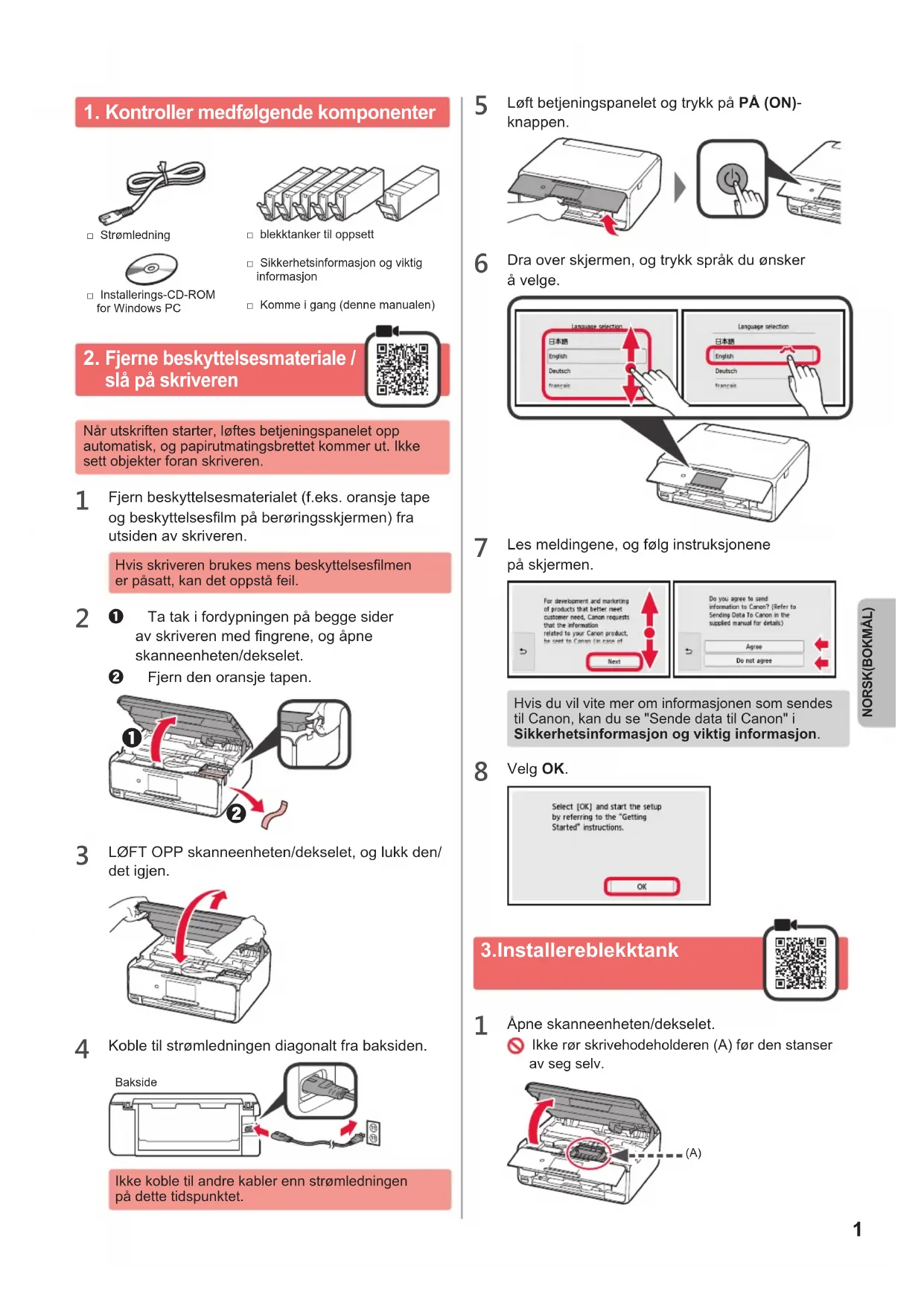 Kontroller medfølgende komponenter □ Installerings-CD-ROM for Windows PC□ Strømledning□ Sikkerhetsinformasjon og viktig informasjon□ blekktanker til oppsett□ Komme i gang (denne manualen)