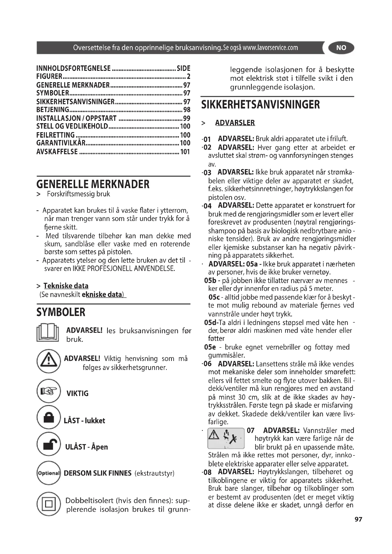 - 03 ADVARSEL: Ikke bruk apparatet når strømka- belen eller viktige deler av apparatet er skadet, f.eks. sikkerhetsinnretninger, høytrykkslangen for pistolen osv.