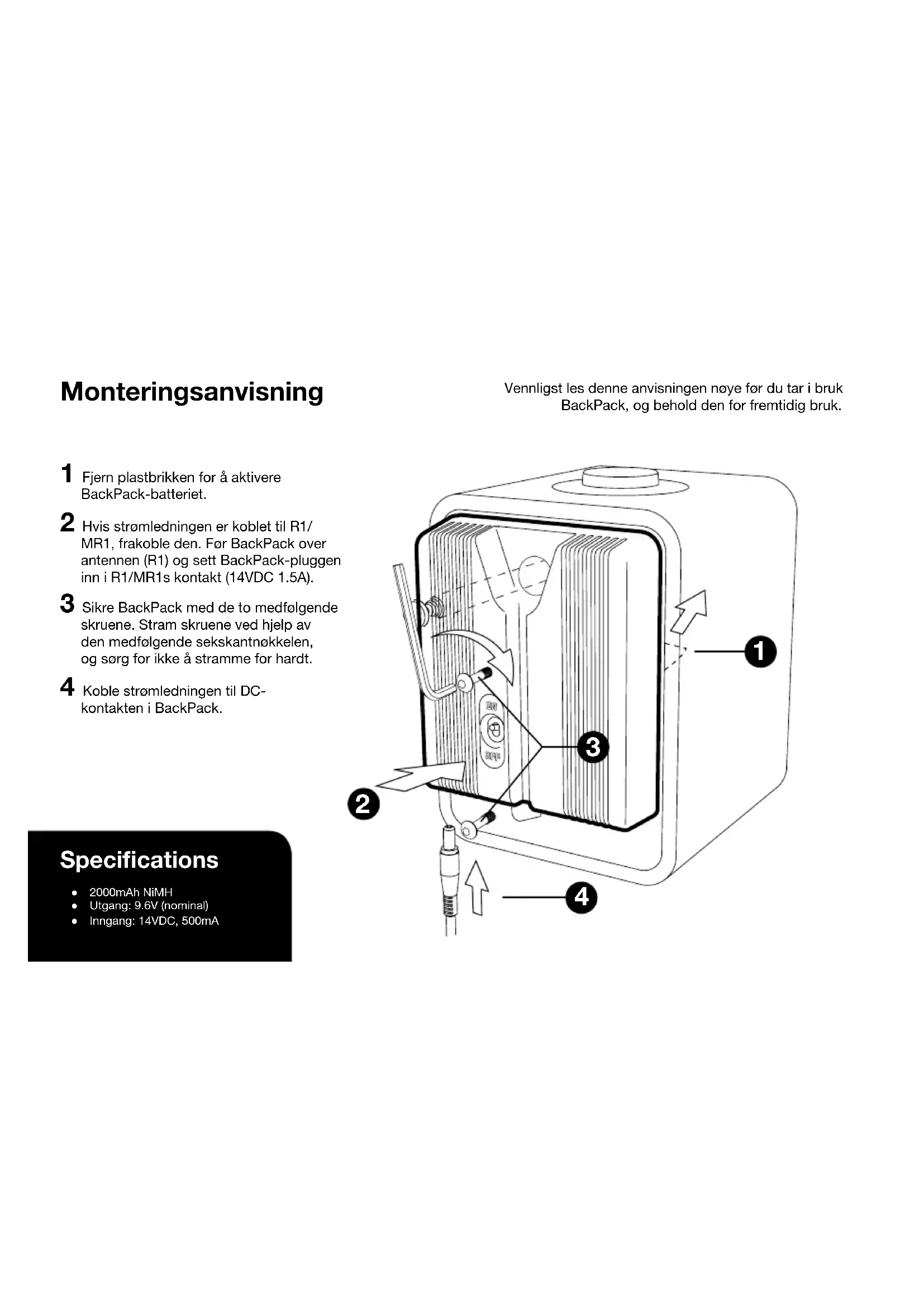 - Backpack skal bare lades med en R1/MR1 stromkabel (14VDC 2A).