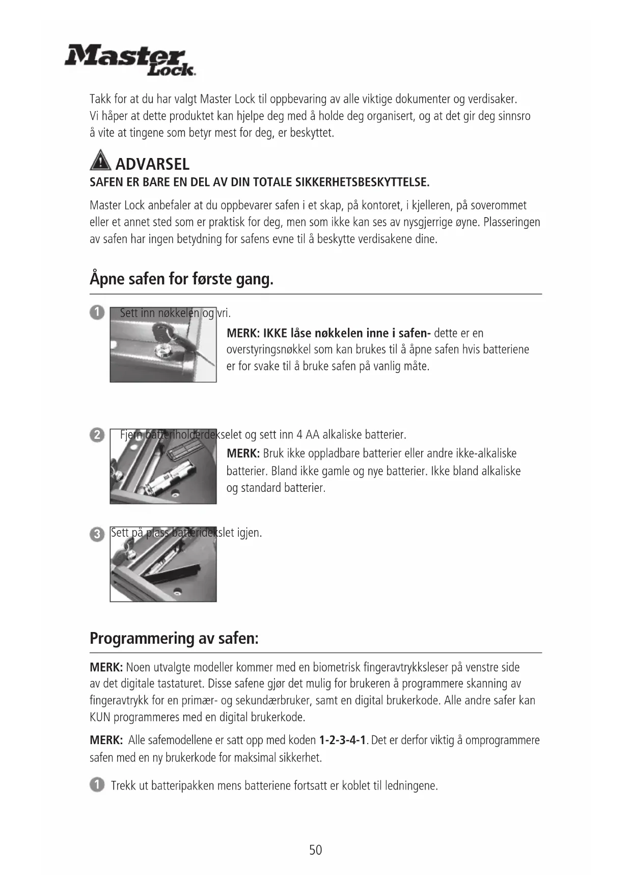 Takk for at du har valgt Master Lock til oppbevaring av alle viktige dokumenter og verdisaker. Vi håper at dette produktet kan hjelpe deg med å holde deg organisert, og at det gir deg sinnsro å vite at tingene som betyr mest for deg, er beskyttet.