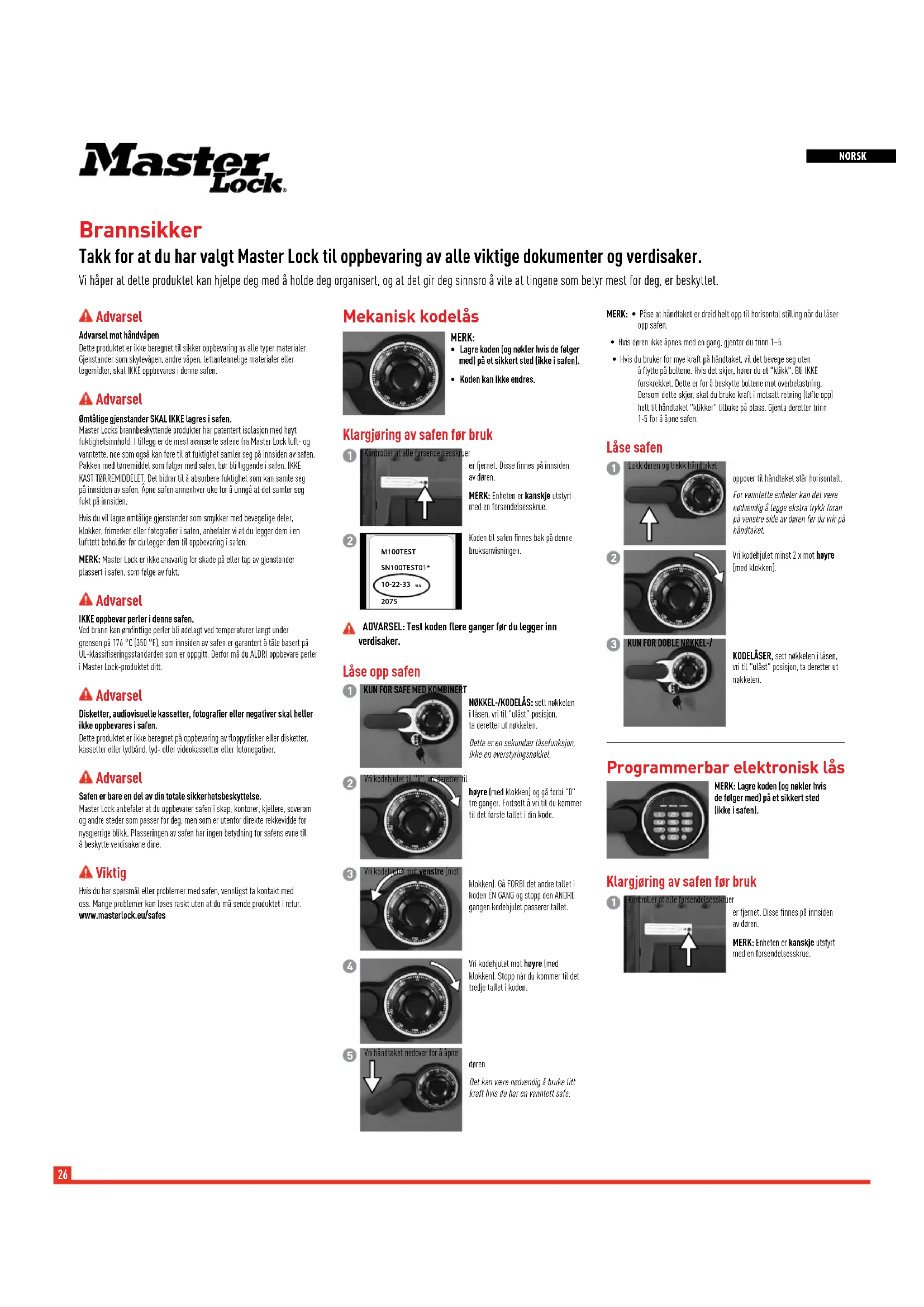MERK: Master Lock er ike answartig for skade pa eller tap av gjenstander plassert i safen, som feige av fukt.
