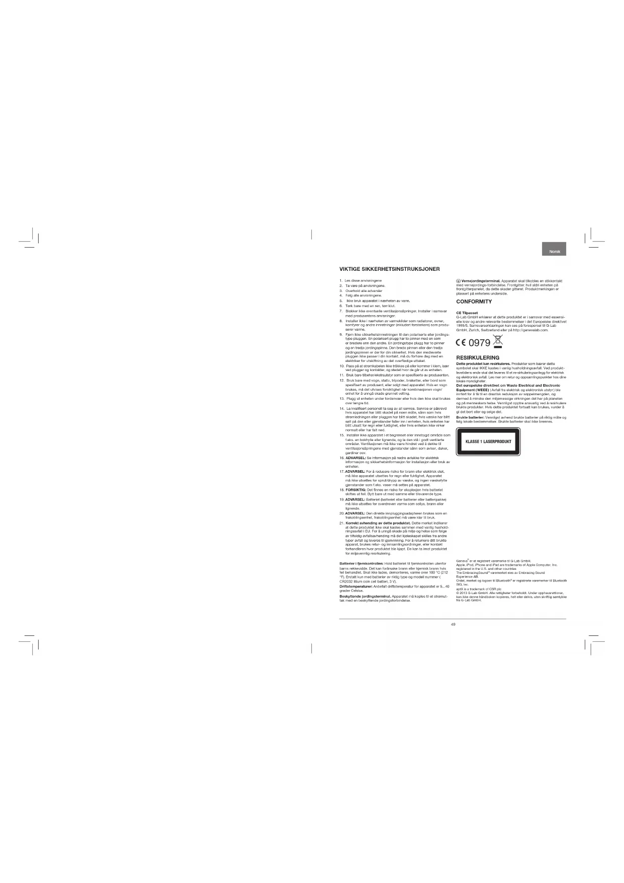 Norsk 1. Les disse anvisningene 2. Ta vare på anvisningene.3. Overhold alle advarsler4. Følg alle anvisningene. 5. Ikke bruk apparatet i nærheten av vann.6. Tørk bare med en ren, tørr klut.7. Blokker ikke eventuelle ventilasjonsåpninger. Installer i samsvar med produsentens anvisninger.8. Installer ikke i nærheten av varmekilder som radiatorer, ovner, komfyrer og andre innretninger (inkludert forsterkere) som produ-serer varme. 9. Fjern ikke sikkerhetsinnretningen til den polariserte eller jordings-type pluggen. En polarisert plugg har to pinner med en som er bredere enn den andre. En jordingstype plugg har to pinner og en tredje jordingspinne. Den brede pinnen eller den tredje jordingspinnen er der for din sikkerhet. Hvis den medleverte pluggen ikke passer i din kontakt, må du forhøre deg med en elektriker for utskiftning av det overødige uttaket.10. Pass på at strømkabelen ikke tråkkes på eller kommer i klem, især ved plugger og kontakter, og stedet hvor de går ut av enheten.11. Bruk bare tilbehør/ekstrautstyr som er spesiserte av produsenten.12. Bruk bare med vogn, stativ, tripoder, braketter, eller bord som spesisert av produsent, eller solgt med apparatet. Hvis en vogn brukes, må det utvises forsiktighet når kombinasjonen vogn/enhet for å unngå skade grunnet velting.13. Plugg ut enheten under tordenvær eller hvis den ikke skal brukes over lengre tid.14. La kvalisert personell ta seg av all service. Service er påkrevd hvis apparatet har blitt skadet på noen måte, sånn som hvis strømledningen eller pluggen har blitt skadet, hvis væske har blitt sølt på den eller gjenstander faller inn i enheten, hvis enheten har blitt utsatt for regn eller fuktighet, eller hvis enheten ikke virker normalt eller har falt ned.15. Installer ikke apparatet i et begrenset eller innebygd område som f.eks. en bokhylle eller lignende, og la den stå i godt ventilerte områder. Ventilasjonen må ikke være hindret ved å dekke til ventilasjonsåpningene med gjenstander sånn som aviser, duker, gardiner osv.16. ADVARSEL: Se informasjon på nedre avlukke for elektrisk informasjon og sikkerhetsinformasjon før installasjon eller bruk av enheten.
