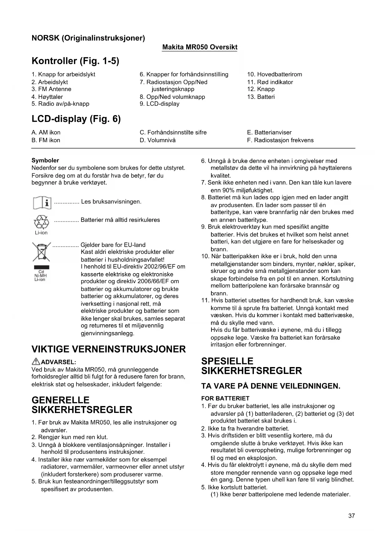 1. Før bruk av Makita MR050, les alle instruksjoner og