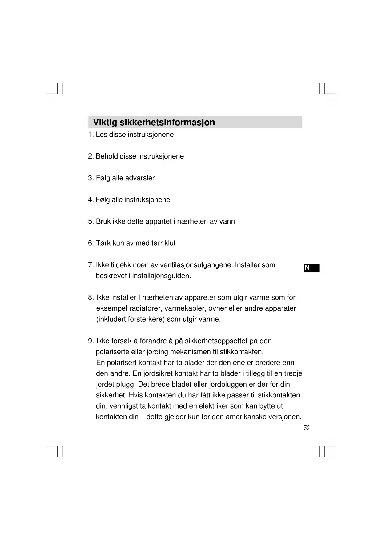 polariserte eller jording mekanismen til stikkontakten. En polarisert kontakt har to blader der den ene er bredere enn den andre. En jordsikret kontakt har to blader i tillegg til en tredje jordet plugg. Det brede bladet eller jordpluggen er der for din sikkerhet. Hvis kontakten du har fått ikke passer til stikkontakten din, vennligst ta kontakt med en elektriker som kan bytte ut kontakten din – dette gjelder kun for den amerikanske versjonen.51