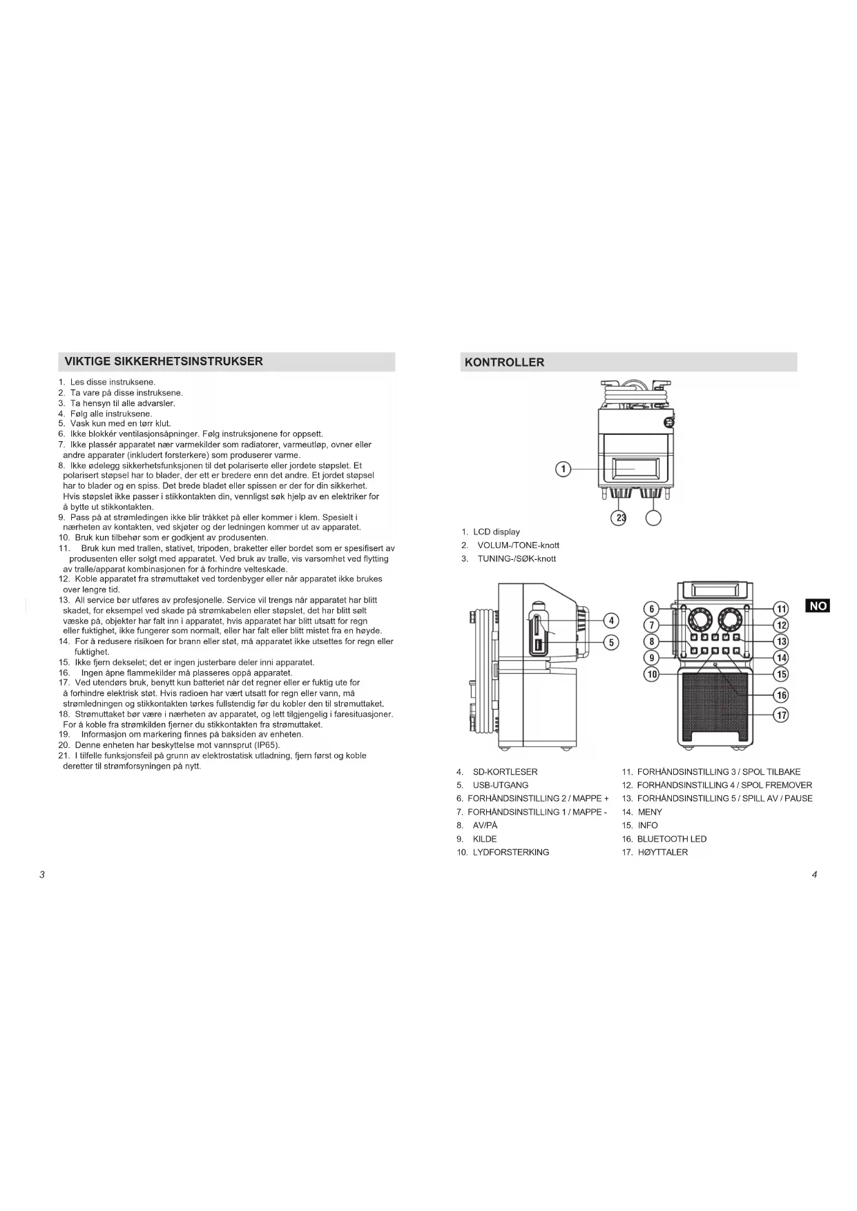 NO43 VIKTIGE SIKKERHETSINSTRUKSER 1. Les disse instruksene.2. Ta vare på disse instruksene.3. Ta hensyn til alle advarsler.4. Følg alle instruksene.5. Vask kun med en tørr klut.6. Ikke blokkér ventilasjonsåpninger. Følg instruksjonene for oppsett.7. Ikke plassér apparatet nær varmekilder som radiatorer, varmeutløp, ovner eller andre apparater (inkludert forsterkere) som produserer varme.8. Ikke ødelegg sikkerhetsfunksjonen til det polariserte eller jordete støpslet. Et polarisert støpsel har to blader, der ett er bredere enn det andre. Et jordet støpsel har to blader og en spiss. Det brede bladet eller spissen er der for din sikkerhet. Hvis støpslet ikke passer i stikkontakten din, vennligst søk hjelp av en elektriker for å bytte ut stikkontakten. 9. Pass på at strømledingen ikke blir tråkket på eller kommer i klem. Spesielt i nærheten av kontakten, ved skjøter og der ledningen kommer ut av apparatet. 10. Bruk kun tilbehør som er godkjent av produsenten.11. Brukkunmedtrallen,stativet,tripoden,braketterellerbordetsomerspesisertav produsentenellersolgtmedapparatet.Vedbrukavtralle,visvarsomhetvedytting av tralle/apparat kombinasjonen for å forhindre velteskade. 12. Koble apparatet fra strømuttaket ved tordenbyger eller når apparatet ikke brukes over lengre tid.13. All service bør utføres av profesjonelle. Service vil trengs når apparatet har blitt skadet, for eksempel ved skade på strømkabelen eller støpslet, det har blitt sølt væske på, objekter har falt inn i apparatet, hvis apparatet har blitt utsatt for regn eller fuktighet, ikke fungerer som normalt, eller har falt eller blitt mistet fra en høyde.14. For å redusere risikoen for brann eller støt, må apparatet ikke utsettes for regn eller fuktighet.15. Ikke fjern dekselet; det er ingen justerbare deler inni apparatet.16. Ingenåpneammekildermåplasseresoppåapparatet.17. Ved utendørs bruk, benytt kun batteriet når det regner eller er fuktig ute for å forhindre elektrisk støt. Hvis radioen har vært utsatt for regn eller vann, må strømledningen og stikkontakten tørkes fullstendig før du kobler den til strømuttaket.18. Strømuttaket bør være i nærheten av apparatet, og lett tilgjengelig i faresituasjoner. For å koble fra strømkilden fjerner du stikkontakten fra strømuttaket.19. Informasjonommarkeringnnespåbaksidenavenheten.20. Denne enheten har beskyttelse mot vannsprut (IP65).21. I tilfelle funksjonsfeil på grunn av elektrostatisk utladning, fjern først og koble deretter til strømforsyningen på nytt. KONTROLLER 1. LCD display2. VOLUM-/TONE-knott3. TUNING-/SØK-knott4. SD-KORTLESER5. USB-UTGANG6. FORHÅNDSINSTILLING 2 / MAPPE +7. FORHÅNDSINSTILLING 1 / MAPPE -8. AV/PÅ9. KILDE10. LYDFORSTERKING 11. FORHÅNDSINSTILLING 3 / SPOL TILBAKE12. FORHÅNDSINSTILLING 4 / SPOL FREMOVER13. FORHÅNDSINSTILLING 5 / SPILL AV / PAUSE14. MENY15. INFO16. BLUETOOTH LED17. HØYTTALER
