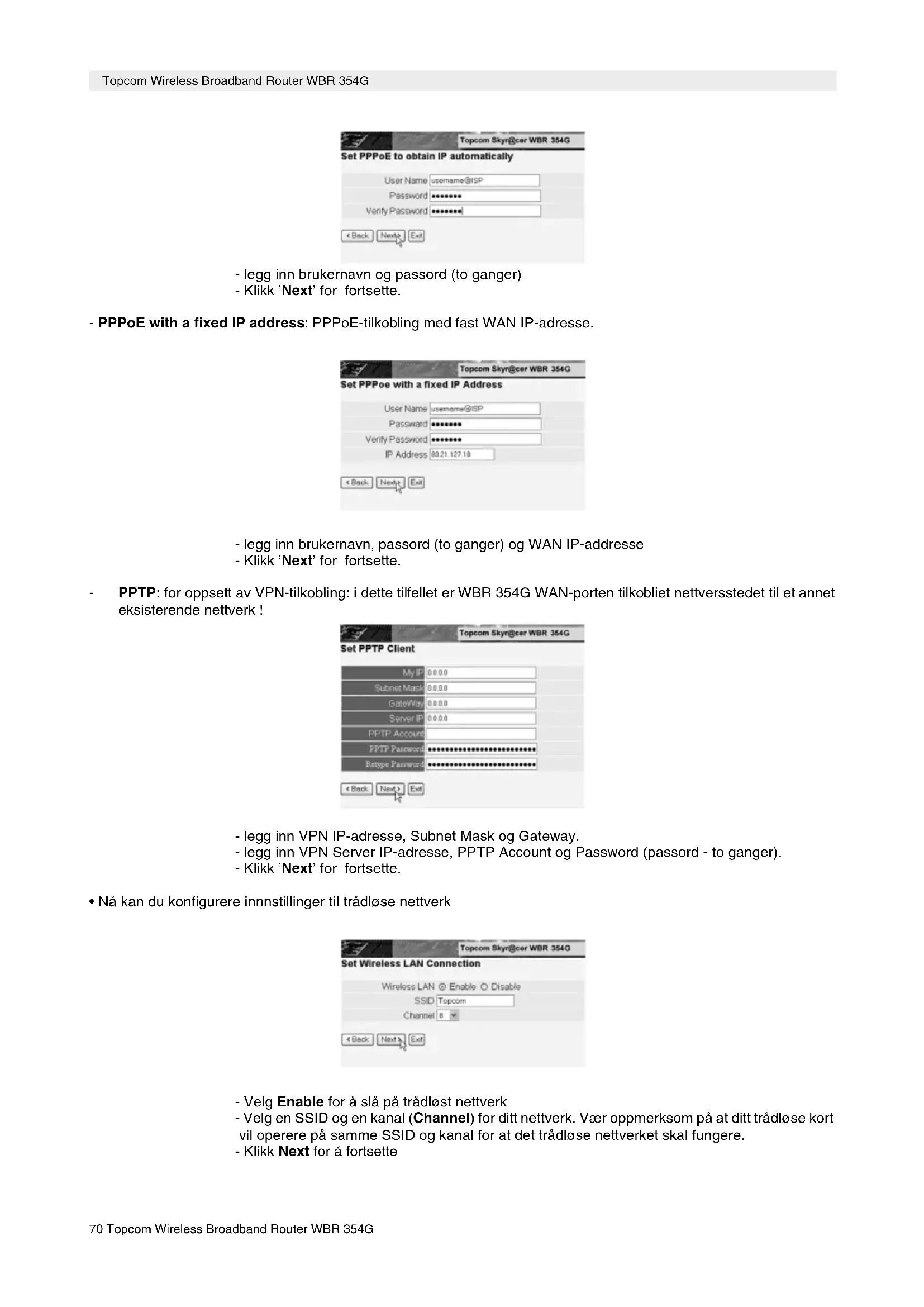 - Nå kan du endre LAN-innstillingene: - LAN IP-adresse og nettverksmaske (Subnet mask) kan endres. - Router DHCP-serveren kan være Disabled / Enabled - DHCP-området kan settes. - Klikk ’Next’ for fortsette. - Velg tilkoblingstype (Connection Type) - Klikk ’Next’ for fortsette. - Obtain IP automatilally (DHCP-klient): denne tilkoblingen benyttes som oftest for tilkobling av WBR 354G til et kabelmodem. - Fixed IP address: for tilkoblinger med fast WAN IP-adresse. - legg inn WAN IP, Subnet Mask, Gateway og DNS-adresser. - Klikk ’Next’ for fortsette. - PPPoE to obtain IP automatically: benyttes som oftes for tilkobling av WBR 354G til en ADSL-Ethernetbro med PP- PoE oppringing.70 Topcom Wireless Broadband Router WBR 354G Topcom Wireless Broadband Router WBR 354G - legg inn brukernavn og passord (to ganger) - Klikk ’Next’ for fortsette. - PPPoE with a fixed IP address: PPPoE-tilkobling med fast WAN IP-adresse. - legg inn brukernavn, passord (to ganger) og WAN IP-addresse - Klikk ’Next’ for fortsette. - PPTP: for oppsett av VPN-tilkobling: i dette tilfellet er WBR 354G WAN-porten tilkobliet nettversstedet til et annet eksisterende nettverk ! - legg inn VPN IP-adresse, Subnet Mask og Gateway. - legg inn VPN Server IP-adresse, PPTP Account og Password (passord - to ganger). - Klikk ’Next’ for fortsette.