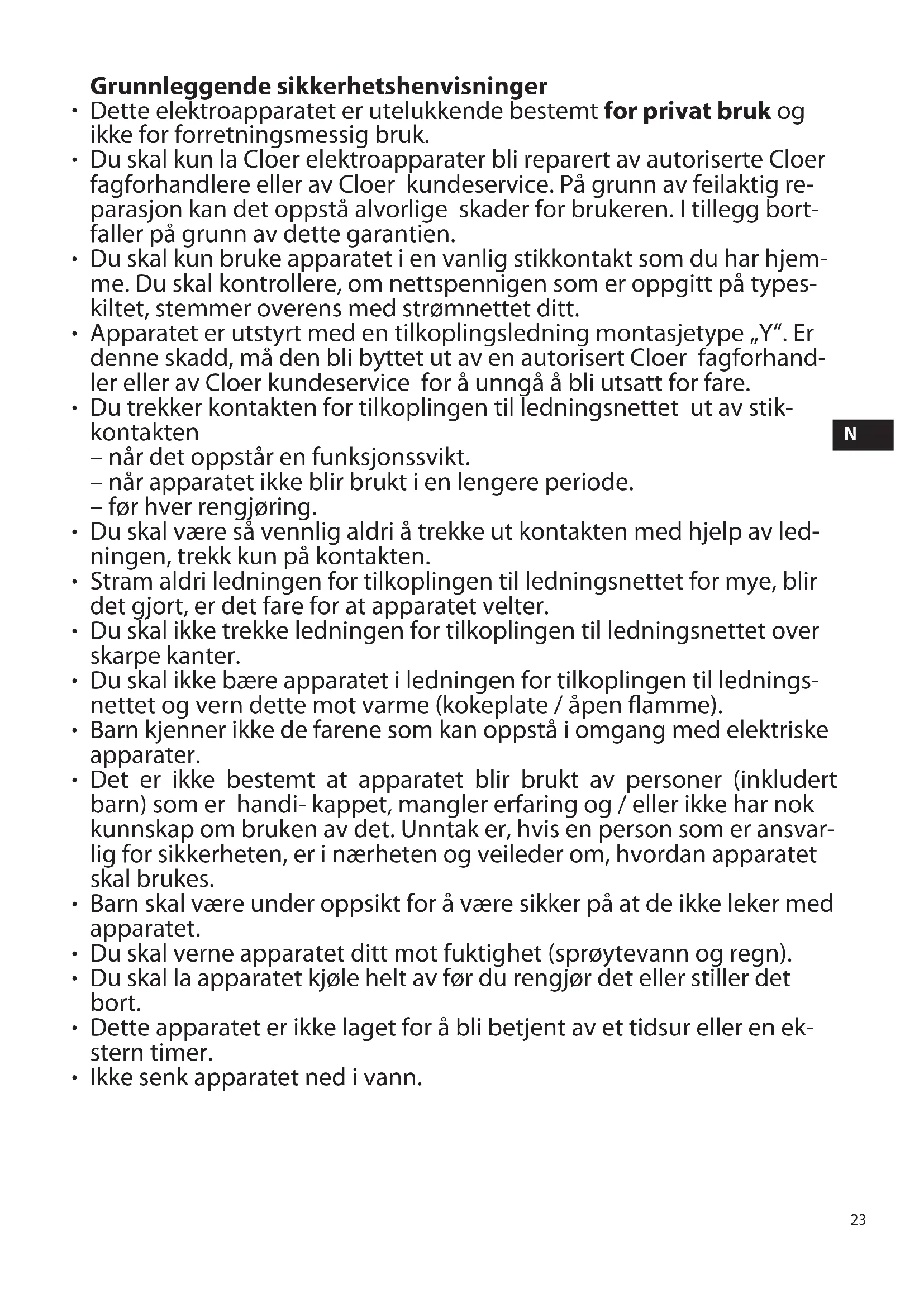 - Du skal kun la Cloer elektrroapparater bli reparent av autoriserte Cloer fagforhandlere aller av Cloer kundeservice. På grunn av feilaktig reparasjon kan det oppsta alvorlige skader forBrukeren. I tillegg bortfaller på grunn av dette garantien.