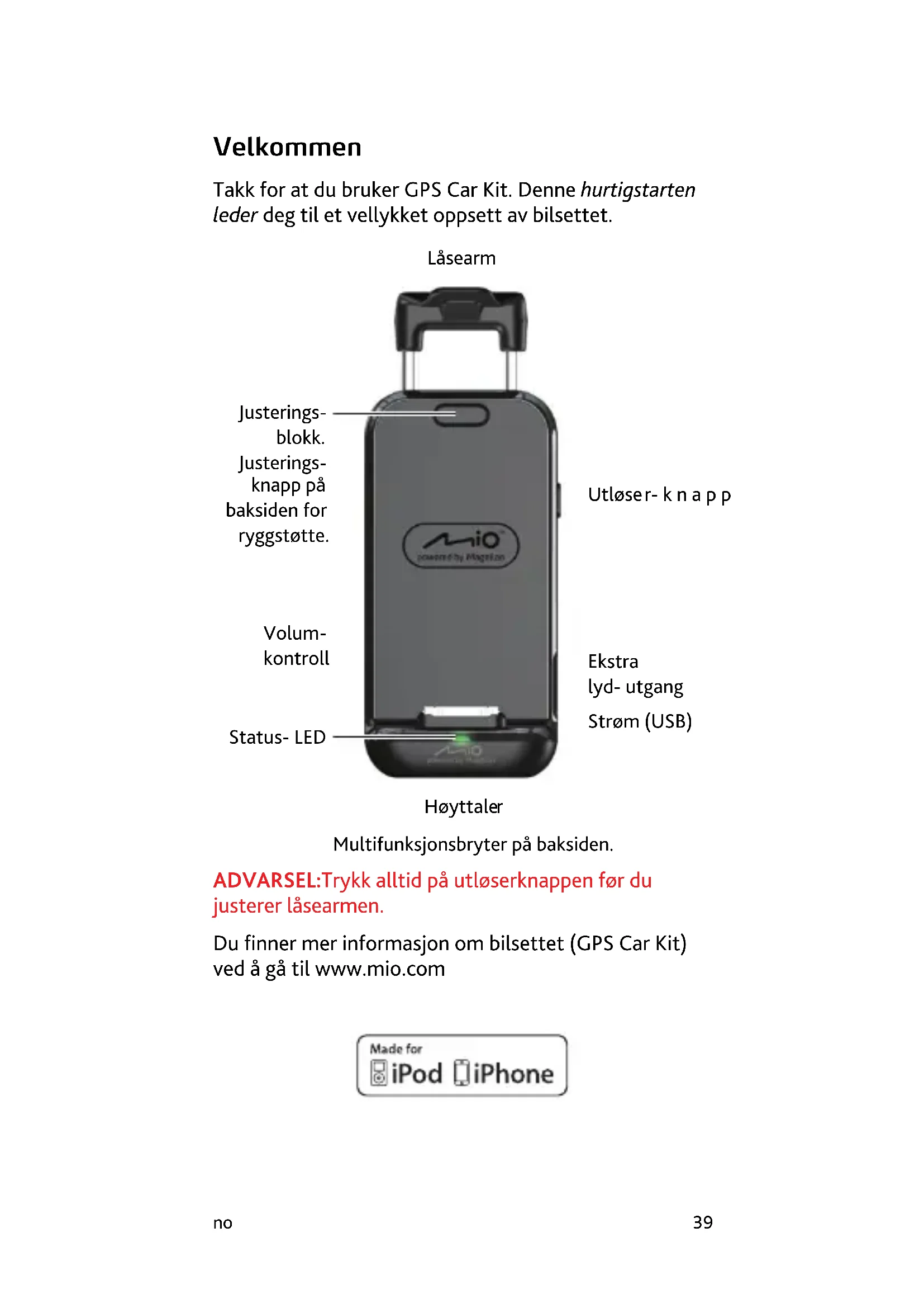 ADVARSEL:Trykk alltid på utløserknappen før du justerer låsearmen. Du finner mer informasjon om bilsettet (GPS Car Kit) ved å gå til www.mio.com