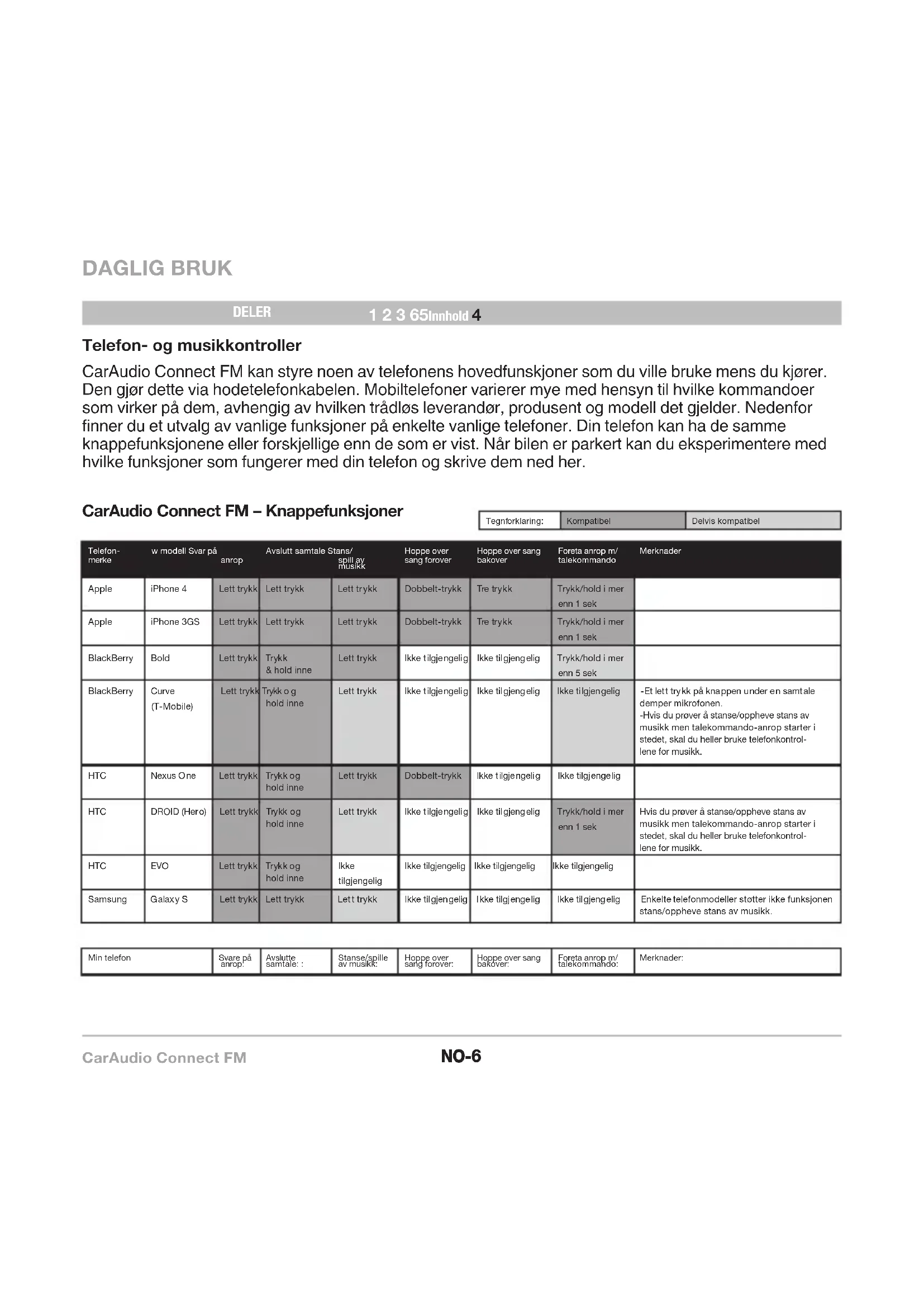 4. Hvis du snakker på telefonen allerede eller lytter til musikk, vil lyden overføres til bilhøyttalerne.CarAudio Connect FM NO-6 DELER 1 2 3 65Innhold 4 DAGLIG BRUK Telefon- og musikkontroller CarAudio Connect FM kan styre noen av telefonens hovedfunskjoner som du ville bruke mens du kjører. Den gjør dette via hodetelefonkabelen. Mobiltelefoner varierer mye med hensyn til hvilke kommandoer som virker på dem, avhengig av hvilken trådløs leverandør, produsent og modell det gjelder. Nedenfor finner du et utvalg av vanlige funksjoner på enkelte vanlige telefoner. Din telefon kan ha de samme knappefunksjonene eller forskjellige enn de som er vist. Når bilen er parkert kan du eksperimentere med hvilke funksjoner som fungerer med din telefon og skrive dem ned her. CarAudio Connect FM – Knappefunksjoner Telefon-merkew modell Svar på anropAvslutt samtale Stans/ spill av musikkHoppe over sang foroverHoppe over sang bakoverForeta anrop m/talekommandoMerknader Apple iPhone 4 Lett trykk Lett trykk Lett trykk Dobbelt-trykk Tre tr ykk Trykk/hold i mer enn 1 sek Apple iPhone 3GS Lett trykk Lett trykk Lett trykk Dobbelt-trykk Tre tr ykk Trykk/hold i mer enn 1 sek BlackBerry Bold Lett trykk Trykk & hold inne Lett trykk Ikke tilgjengelig Ikke tilgjengelig Trykk/hold i mer enn 5 sekBlackBerry Curve (T-Mobile)Lett trykk Trykk o g hold inne Lett trykk Ikke tilgjengelig Ikke tilgjengelig Ikke tilgjengelig - Et lett trykk på knappen under en samtale demper mikrofonen. -Hvis du prøver å stanse/oppheve stans av musikk men talekommando-anrop starter i stedet, skal du heller bruke telefonkontrol-lene for musikk. HTC Nexus One Lett trykk Trykk o g hold inne Lett trykk Dobbelt-trykk Ikke tilgjengelig Ikke tilgjengelig HTC DROID (Hero) Lett trykk Trykk og hold inne Lett trykk Ikke tilgjengelig Ikke tilgjengelig Trykk/hold i mer enn 1 sekHvis du prøver å stanse/oppheve stans av musikk men talekommando-anrop starter i stedet, skal du heller bruke telefonkontrol-lene for musikk. HTC EVO Lett trykk Trykk o g hold inneIkke tilgjengeligIkke tilgjengelig Ikke tilgjengelig Ikke tilgjengelig Samsung Galaxy S Lett trykk Lett trykk Lett trykk Ikke tilgjengelig Ikke tilgjengelig Ikke tilgjengelig Enkelte telefonmodeller støtter ikke funksjonen stans/oppheve stans av musikk.Min telefon Svare på anrop:Avslutte samtale: :Stanse/spille av musikk:Hoppe over sang forover:Hoppe over sang bakover:Foreta anrop m/talekommando:Merknader: Tegnforklaring: Kompatibel Delvis kompatibelCarAudio Connect FM NO-7 DELER 1 2 3 64Innhold 5 DAGLIG BRUK Lydtjenester på nett Hvis du bruker direkteavspillingstjenestene Pandora