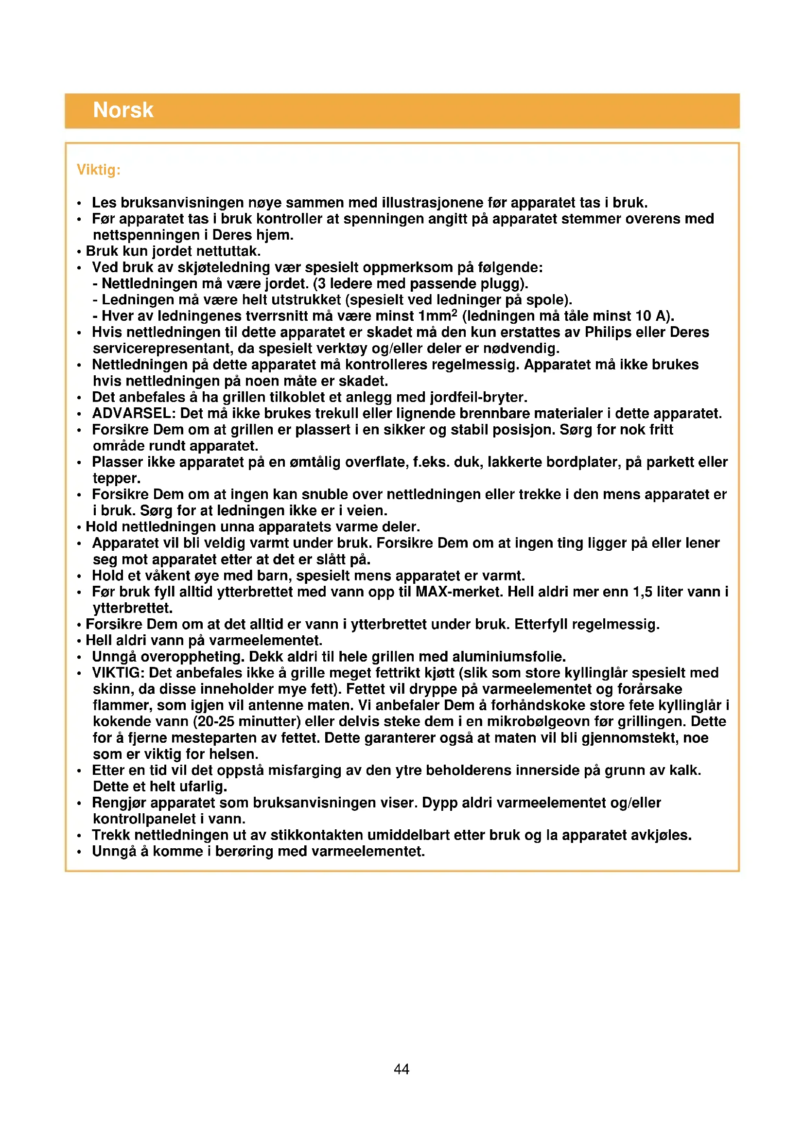 VIKTIG: Det anbefales ikke grille meget fettrikt kjott (slik som store kyllinglår spesielt med skinn, da disse inneholder mye fett). Fettet vil dryppe på varmeelementet og forårsake flammer, som igjen vil antennne maten. Vi anbefaler Dem ø forhändskoke store fete kyllinglår i kokende vann (20-25 minutter) eller delvis steke dem i en mikrobølggeovn før grillingen. Dette for ø fjerne mesteparten av fettet. Dette garanterer øgsa at maten vil bli gjennomstekt, noe som er viktig for helsen. - Etter en tid vil det oppsta misfarging av den ytre beholderens innerside på grunn av kalk. Dette et helt ufarlig.