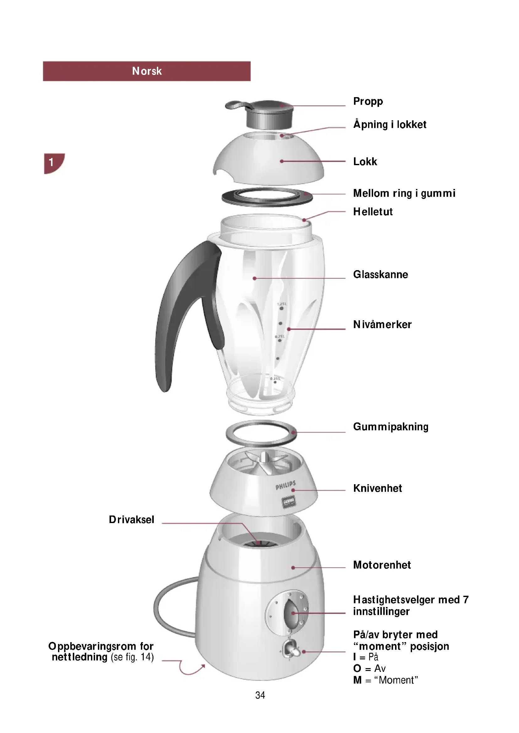 Propp Åpning i lokket Lokk Mellom ring i gummi Helletut Glasskanne Nivåmerker Gummipakning Knivenhet PHILIPS Drivaksel Motorenhet Hastighetsvelger med 7 innstillinger På/av bryter med "moment" posisjon I = På O = Av M = "Moment" gsrom for (se fig. 14)Philips og Alessi har samarbeidet for å skape en unik serie av elektriske kjøkkenartikler, kombinere det aller beste i form og funksjon. Dette er en jubileums modell for å feire suksessen til Philips-Alessi-serien som består av brødrister, kaffetrakter, hurtigkoker og en sitruspresse.