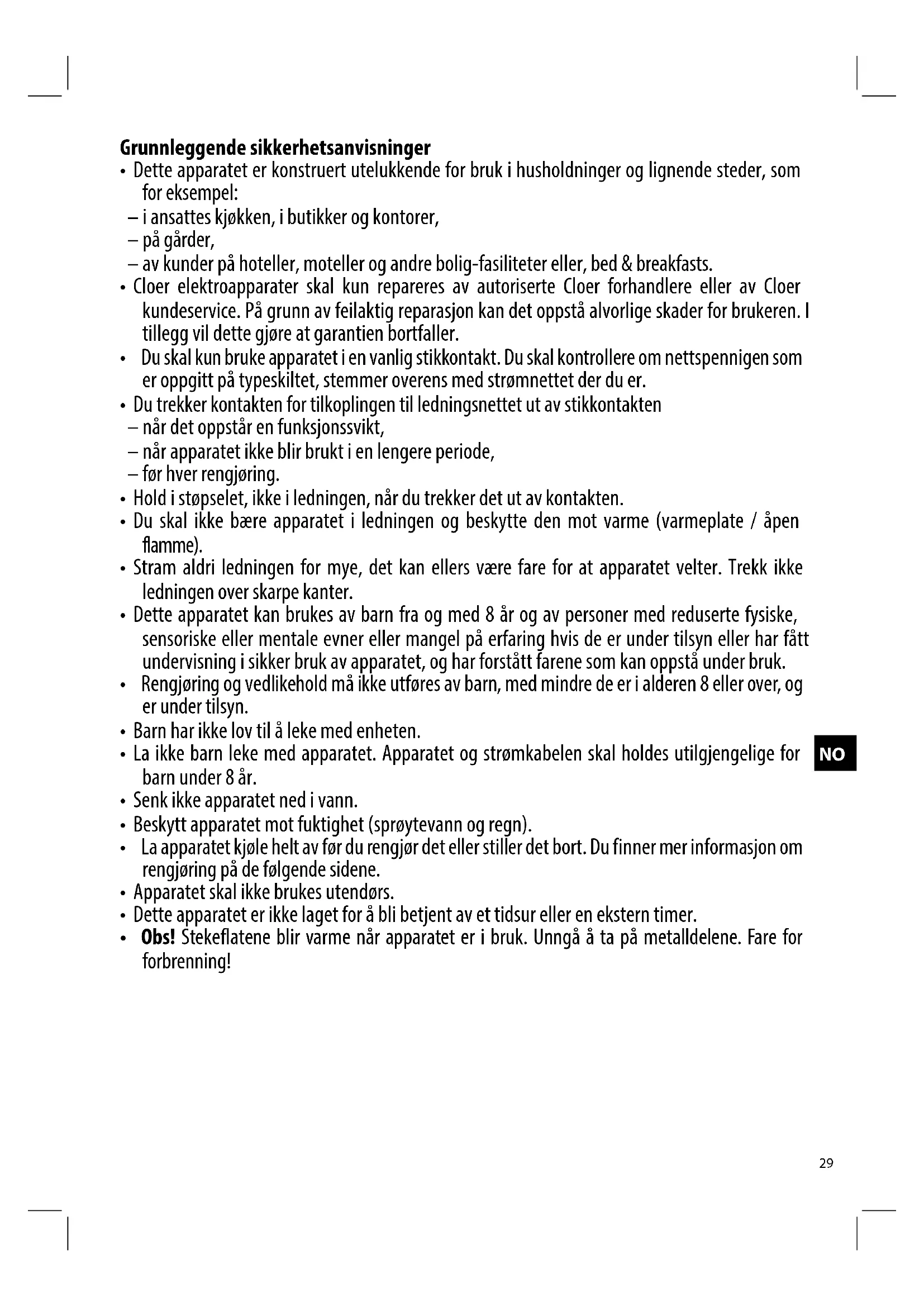 - Obs! Stekeflatene blir varme nár apparatet er i bruk. Unngå à ta på metalldelene. Fare for forbrenning!