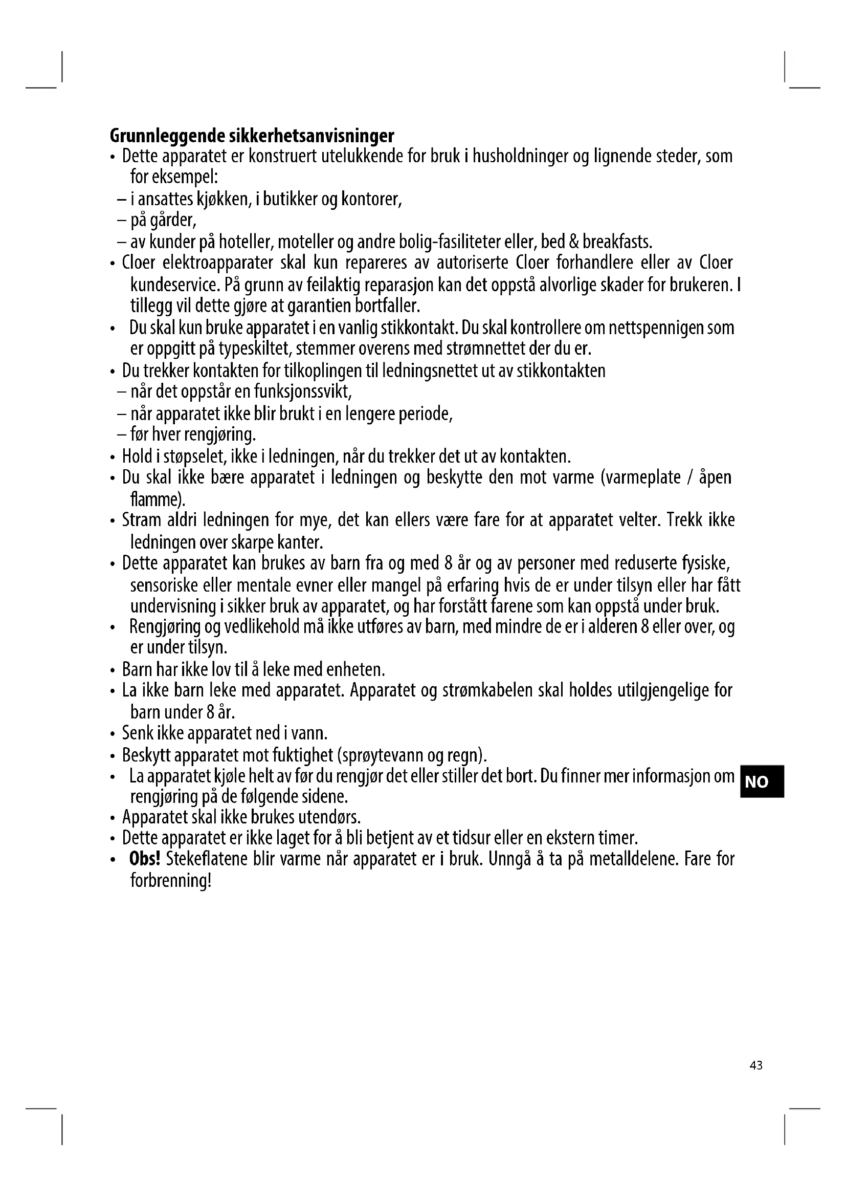 - Cloer elektroapparater skal kun repareres av autoriserte Cloer forhandlere eller av Cloer kundeservice. På grunn av feilaktig reparasjon kan det oppstå alvorlige skader for brukeren. I tillegg vil dette gjøre at garantien bortfaller.