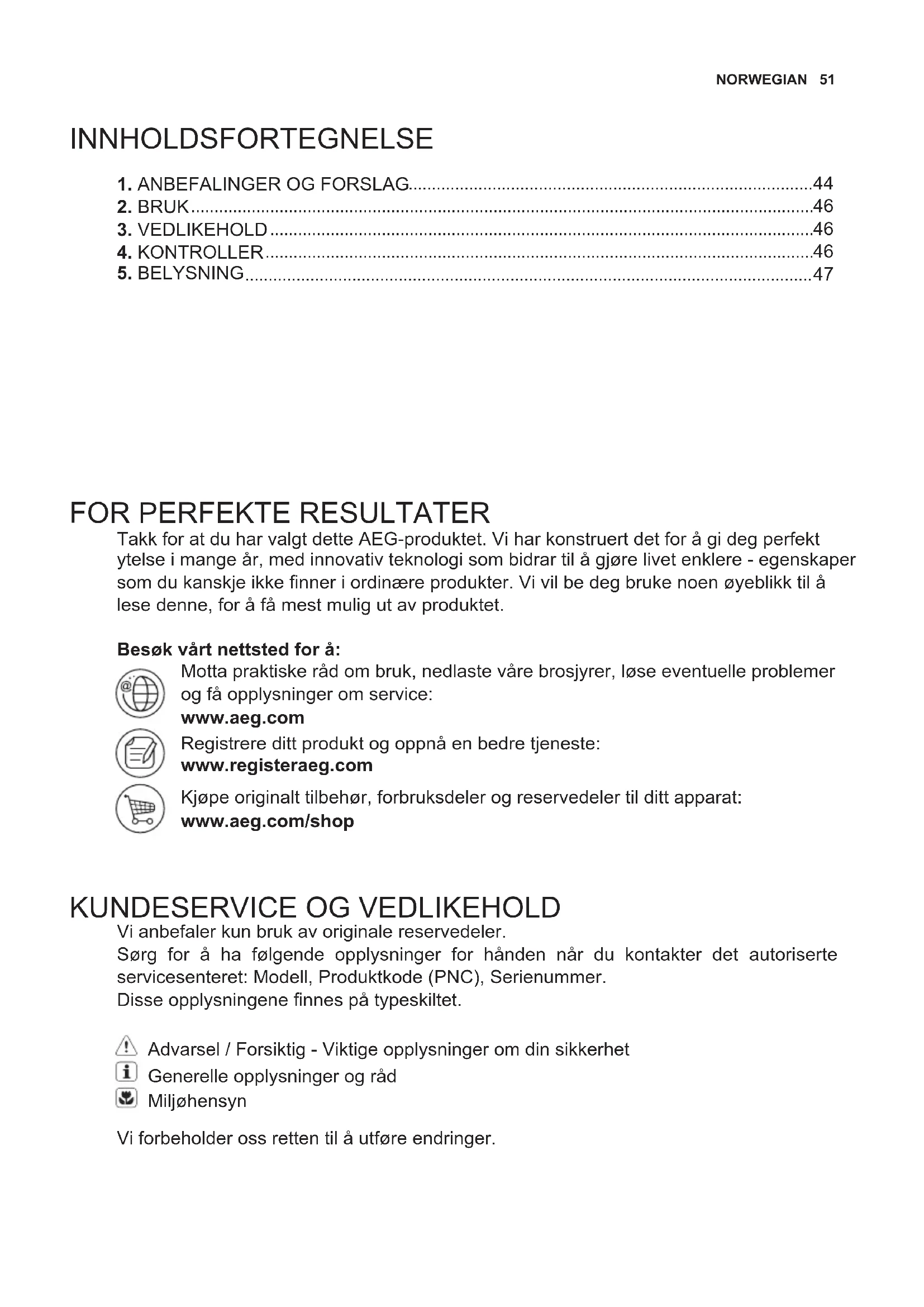 Takk for at du har valgt dette AEG-produktet. Vi har konstruert det for å gi deg perfekt ytelse i mange år, med innovativ teknologi som bidrar til å gjøre livet enklere - egenskaper som du kanskje ikke nner i ordinære produkter. Vi vil be deg bruke noen øyeblikk til å lese denne, for å få mest mulig ut av produktet. Besøk vårt nettsted for å: Motta praktiske råd om bruk, nedlaste våre brosjyrer, løse eventuelle problemer og få opplysninger om service: www.aeg.com Registrere ditt produkt og oppnå en bedre tjeneste: www.registeraeg.com Kjøpe originalt tilbehør, forbruksdeler og reservedeler til ditt apparat: www.aeg.com/shop
